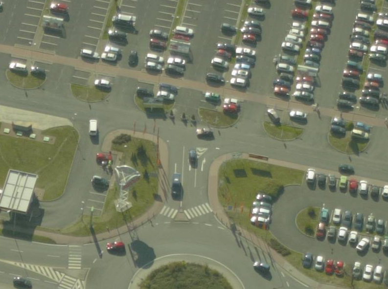 Značka je přímo na (prakticky jediném) vjezdu do areálu obchodního centra a za žlutým autíčkem je kruhový objezd.