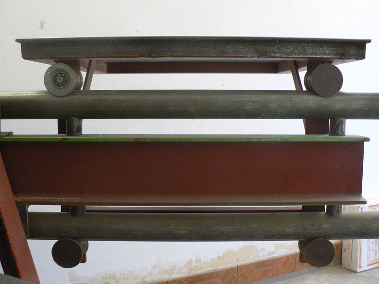 jestli jsem z Vasich fotek dobre pochopil, tak uzivate 4 kolecka na vozeni. Fyzikalne mi hlava nebere, jak to ze ten pojizdny stolek pod zatizenim neuhne doleva, tak jsem se zamyslel a vzniknul obrazek ktery davam do prilohy.