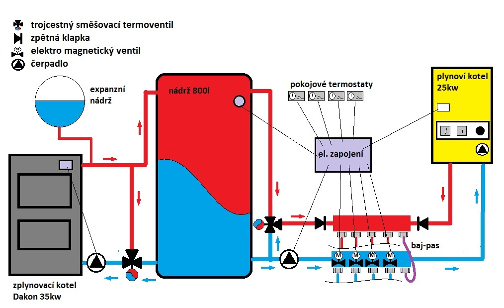 Předělávám na rodinném domku topení a rozhodl jsem se pro kombinací radiátorů a podlahového topení. Abych eliminoval rozdílné vlastnosti obou systémů, rozhodl jsem se každý okruh řídit samostatně. Tedy v každé místnosti pokojový termostat, který bude ovládat elektrotermické hlavice na rozdělovači a spouštět čerpadlo nebo Kotel na plyn. Systém bude mýt dva zdroje tepla. První bude 800L zásobník nahřívaná kotlem na dřevoplyn, z něj bude čerpat vodu oběhové čerpadlo a samozřejmě bude tam směšovací ventil. Pokud v zásobníku dojde teplá voda měl by termostat vypnout čerpadlo na zásobníku a sepnout plynový kotel. Pokusil jsem se to nakreslit a zároveň i zkusil svoje zapojení, ale dopadlo to špatně. Poprvé to odnesl kotel a podruhé se otevřeli všechny elektrotermická hlavice. Prosím podívejte se někdo na to zapojení a navrhněte jak to zapojit aby to fungovalo. Všechny součásti jsou na 220V střídaví proud. Předem děkuji J. Homolka