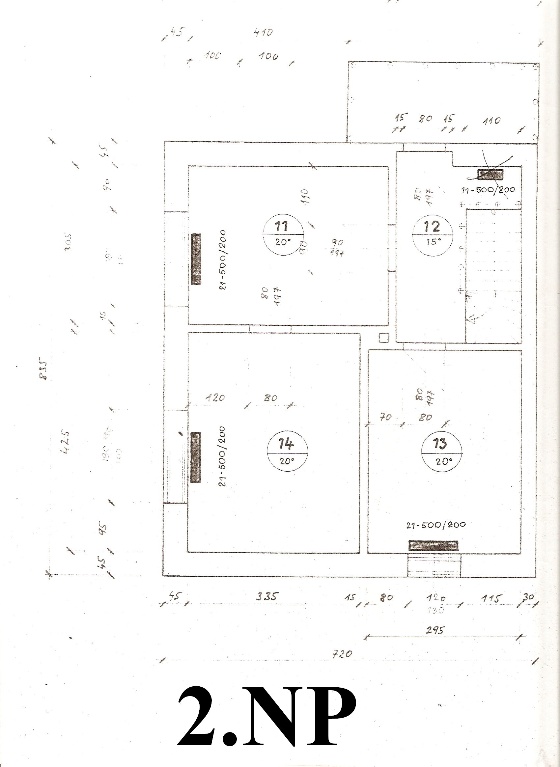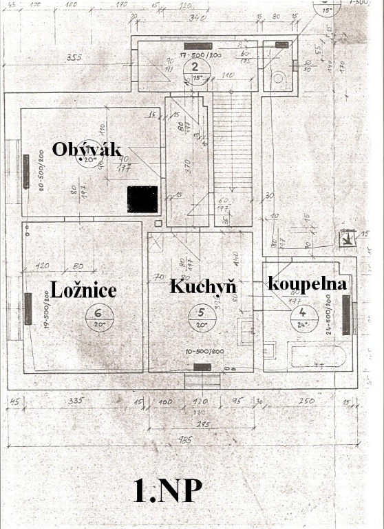 A zde je půdorys pro představu. Teplo je vedené do všech pokojů v patře (11,13,14) a do kuchyně.. Žádná sláva ani v kuchyni, ani v pokojích v patře to není a koupelna s chodbami je absolutně bez šance vahřátí. Efekt tedy pouze přichází v podobě horkého obýváku a ucházející ložnice. Černý čtverec je umístění krbu.