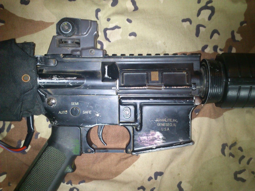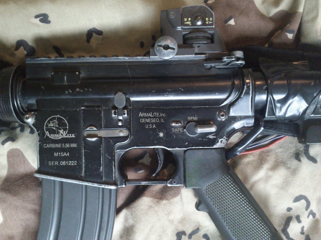 Cože ::) ta zbraň je akorát poškrábaná vypadá to reálněji ale jinak je celý vnitřek nedávno dělaný komplet upgrade od Deep-Fire kabeláž vyvedená do kapsy na pažbě takže se tam vejdou skoro všechny baterie s malým konektorem nevím tisíc je docela málo