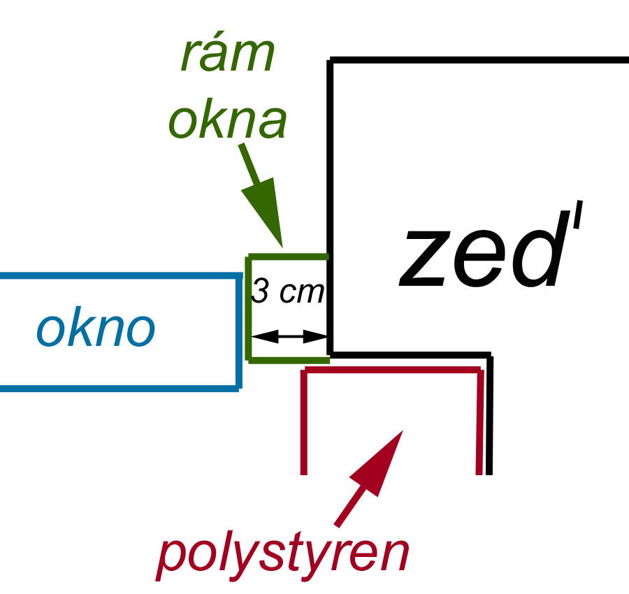 Jinak já chápu, že polystyren má překrýt část rámu. Ale rám je zvenku až na doraz k okennímu otvoru (zdi), takže tloušťku polystyrenu (zvenku) mohu dát max 2cm. Viz obrázek (polystyren na obrázku je zevnitř a ten už tam je. Právě mezi ním a rámem profukuje)
