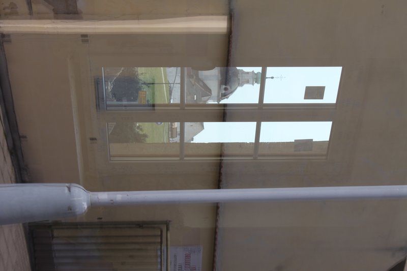 Zas na druhou stranu, kazde zaseknuti do zdi je maly archeologický průzkum. U toho okna pod klenbou…