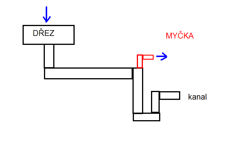 Ve skrince pod drezem. Prumer trubek je cca 40 mm. Příkládám přibližný 3D obrázek situace. Poměry délek by měly odpovídat. Voda stříká z konce označeném "myčka" (průměr cca 20) a to poměrně silně.