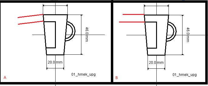 Já teda nejsem strojař, ani na to nemám vejšku, ale podle mě jsou v závislosti na tom, jak budu hrnek potiskovat správně obě varianty. Áčko v případě jednotlivého potisku, když se s tím budu mazat ručně, Béčko může být správně v případě série, kdy budu nastavovat linku.