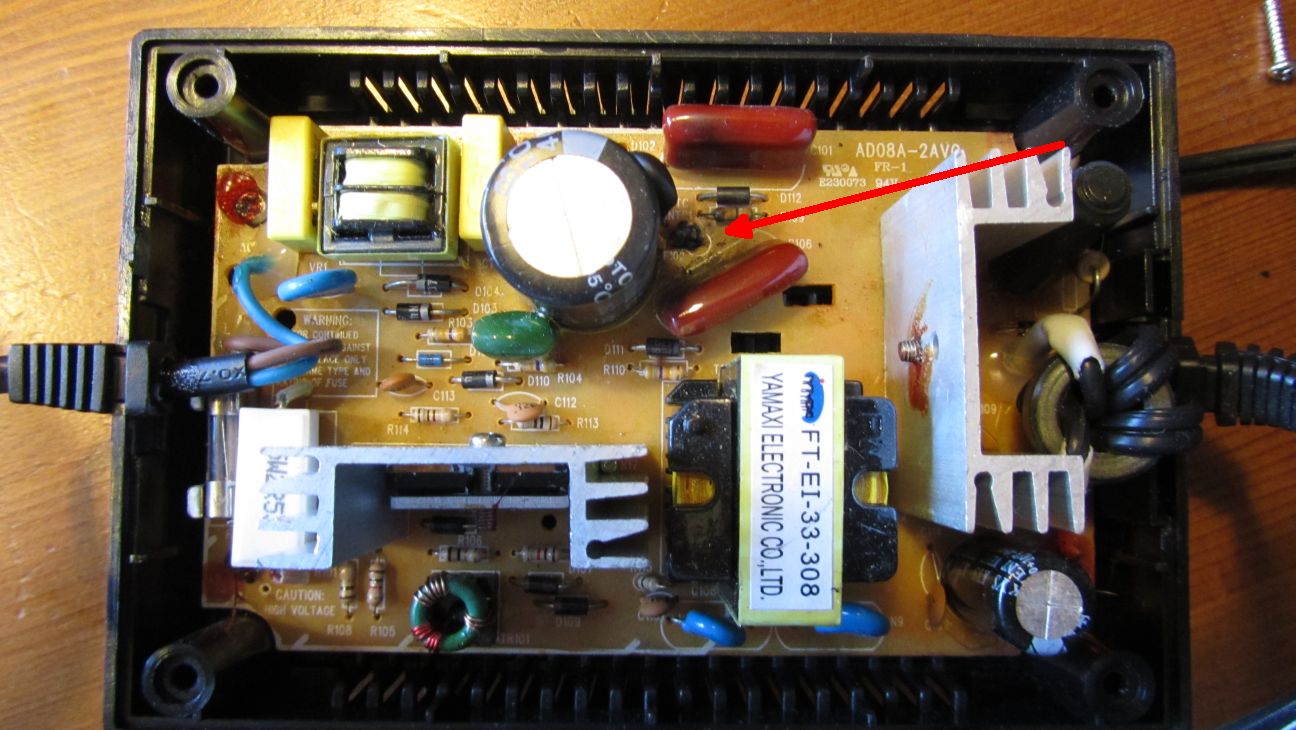 mam transformator z 220 V na 13V/5A, viz obrazky. Puvodne to bylo urceno myslim na pripojeni autolednicky do zdi - na konci je autozapalovacova zasuvka. Pred nedavnem jsem do toho zapojil (uz po mnohokrate) autokompresor a po nejake dobe se z transformatoru zacalo coudit. Rozebral jsem to a je tam spalena jedna soucastka.
