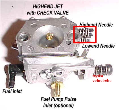 Druhým šroubem za plného plynu otáčejte povolujte/dotahujte dokud motor nedosáhne maxima otáček( a zároveň neprská) pak dotáhněte taky o půl otáčky zpět.