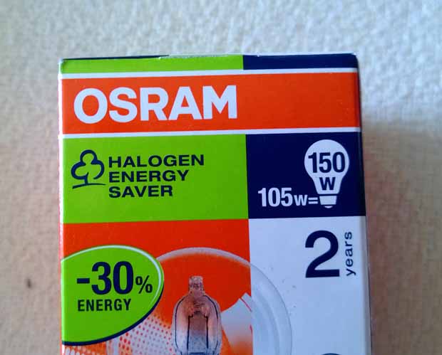 Spořivky mi nesmí do bytu. Vypadá to v lustru strašně a svítí to na pytel. Naštěstí jsem zásoben klasikou a v hlavních světlech v pokoji a kuchyni mám halogenové OSRAM (příkon 105W, svítivost ekvivalentní 150W); těch mám také na pěkných pár let dopředu.