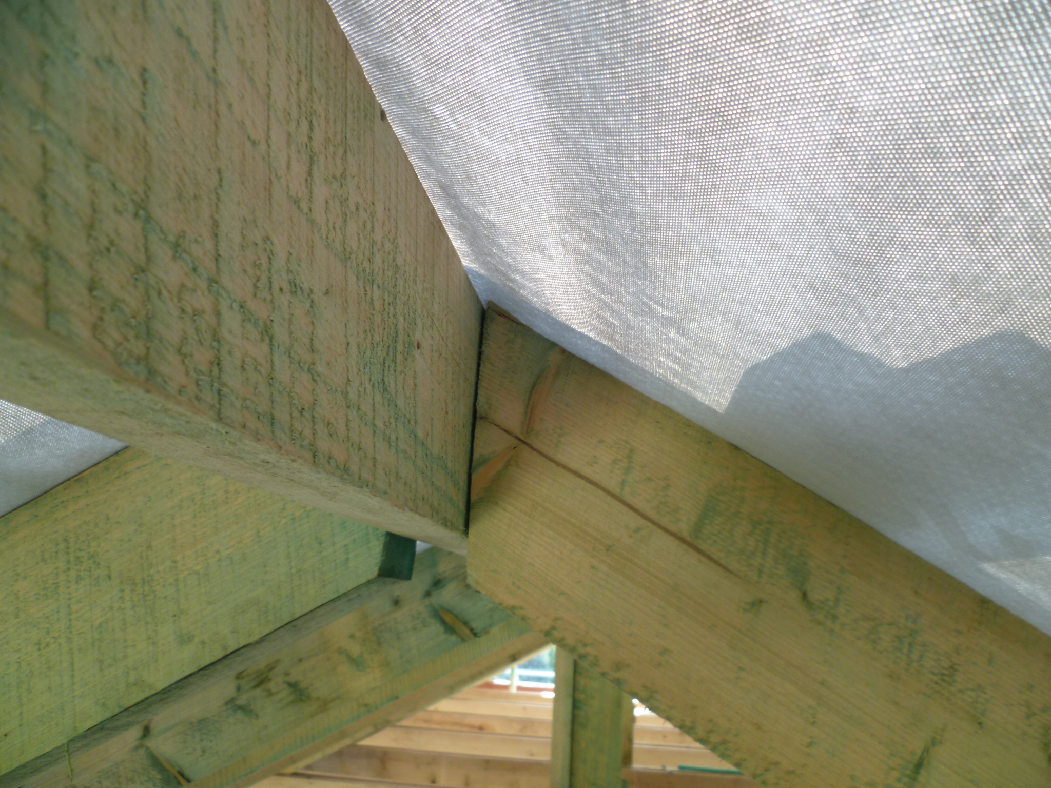 My snad budem za chvíli podle Ameriky i kadit. Také se mi řešení vrcholové vaznice pouhou fošnou nelíbí. Krokve mají být ve vrcholu spojené čepem a stažené svorníkem. Tady se zdají být k fošně jen "lípnuté". Jak je to tam prokotvené? A i kdyby to bylo staticky vyhovující, budí to dojem kočkopsa. Jako firma bych navrhl náhradní řešení přidáním kleštinek přímo pod fošnu a prokotvení do krokví svorníky M16 - varianta C.