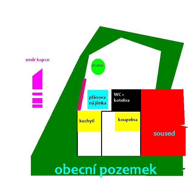 řeším dilema s odpadní jímkou. Koupili jsme domek, kde nejsou odpady.Navíc v dané lokalitě nikdy nepovede kvůli územnímu plánu městská kanalizace.Dle obrázku je možnost vybudovat jímku na odpady do kopce nad barákem. žlutě pak vyznačeny místnosti+ wc s kterých bych potřeboval odpady do ní svést.