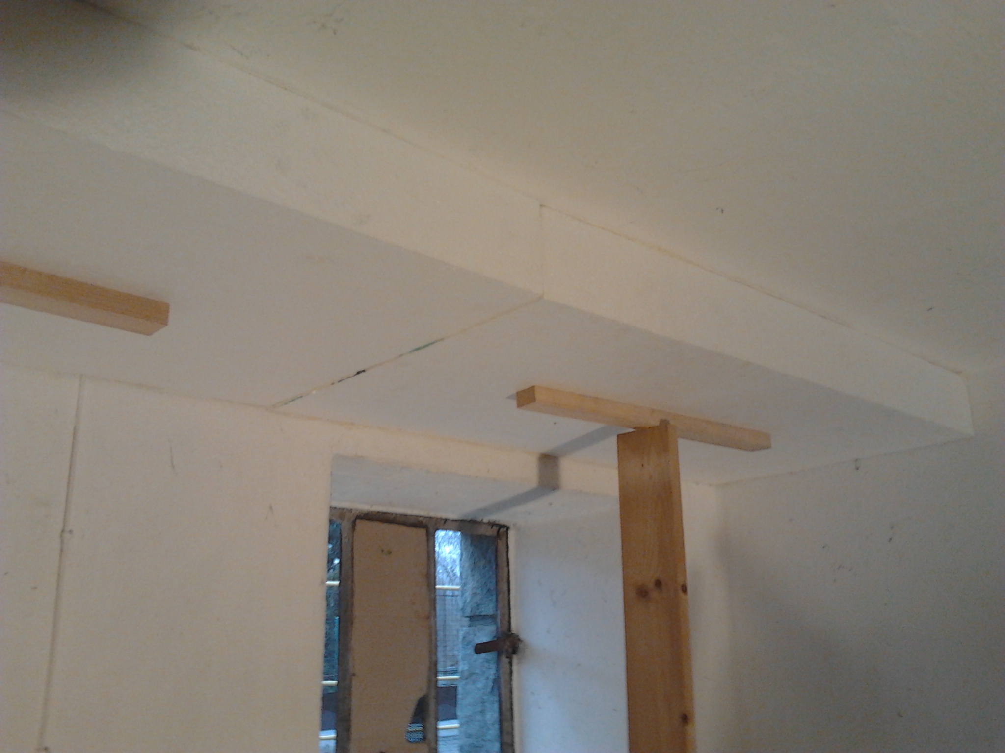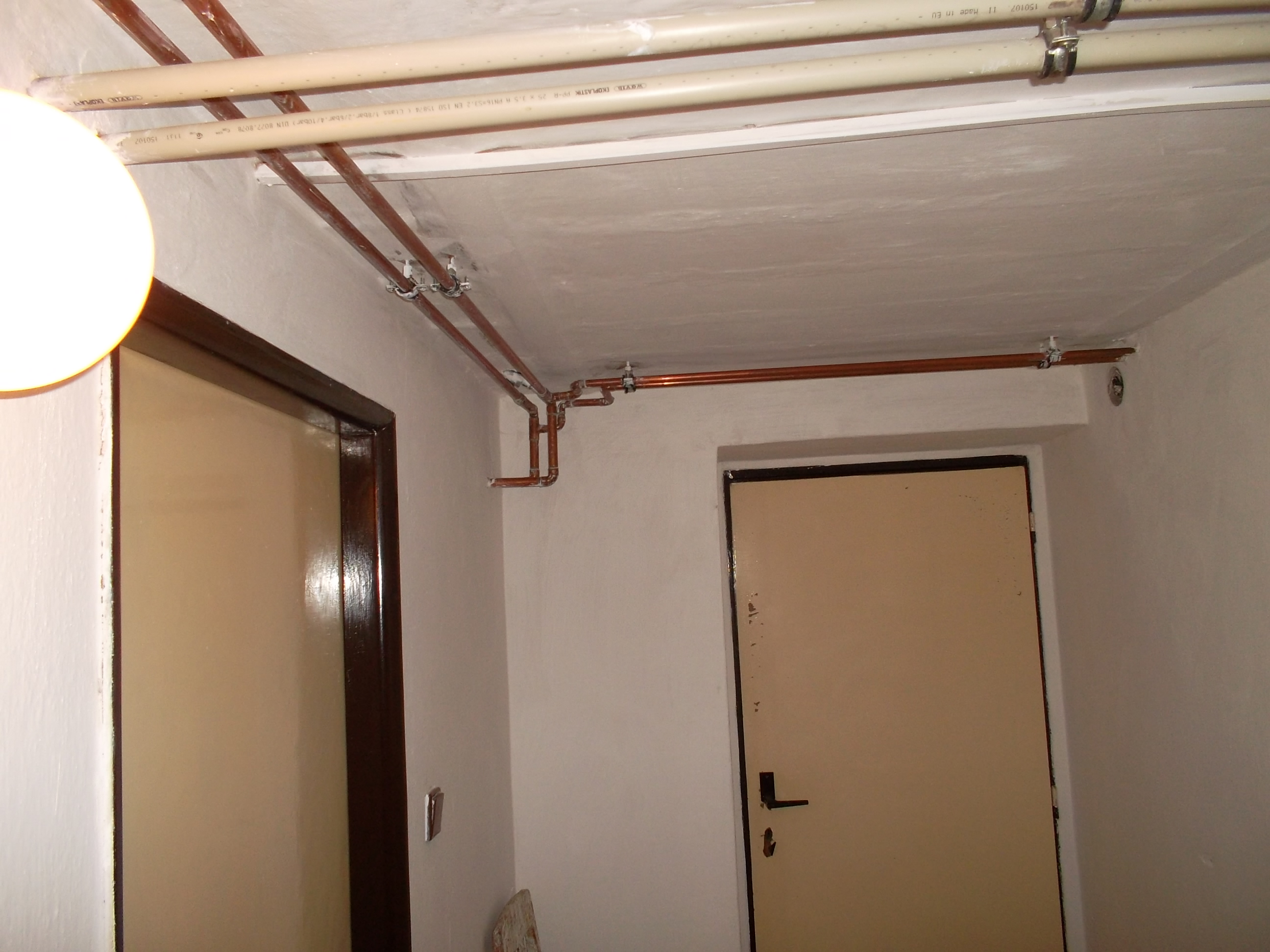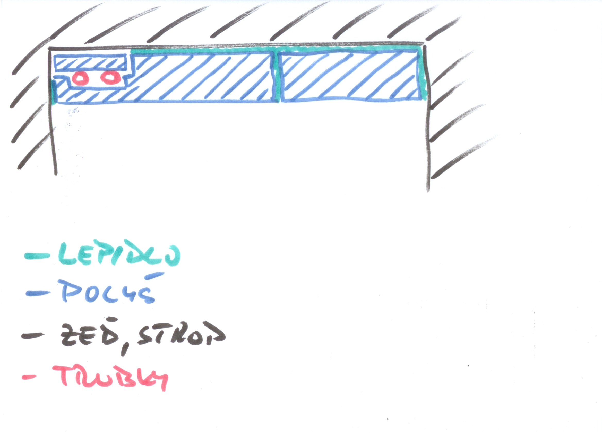 očistit strop, umýt a oškrábat malbu. Změřit kolik cm je mezera mezi stropem a trubkou, tolik tam vložit, zaměřit trubky na další vrtstvu polyše, na pájku udělat očko, vyříznout do polyše drážku pro trubku...nalepit druhou vrstvu a ..