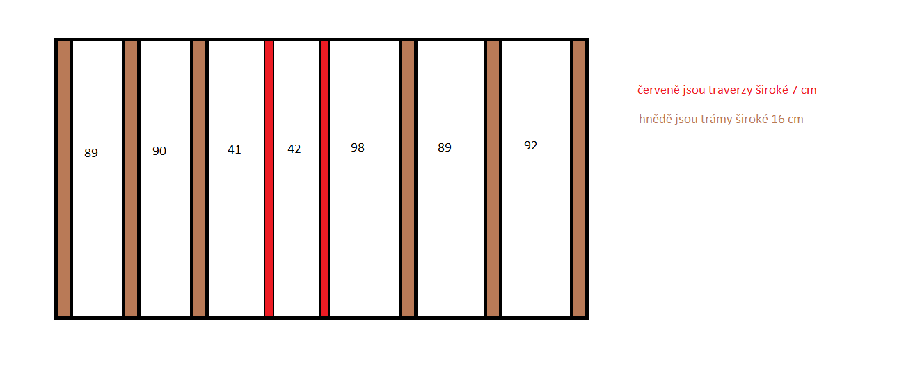 Mezi trámy jsou rozestupy cca 90 cm, viz. přiložený nákres.
