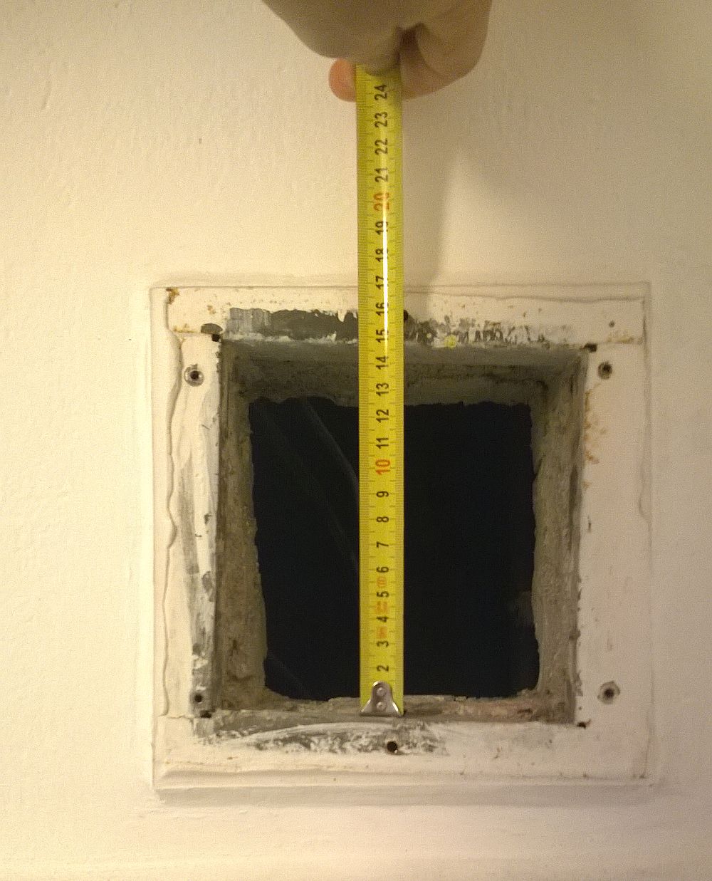 Ventilator (http://goo.gl/CbRSk4) ma kruhovou trubku 125, vejde se do puvodniho otvoru s vodorovnou mezerou cca 1 cm, vertikalne je tam vule cca 2 cm. Je to dane taky tim, ze ta puvodni dira neni zrovna presna, ramecek vepredu je 14.5 x 15 cm (zajimavy rozmer, ze) ale za tim je to take krivolake.