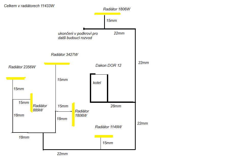 Mockrát Vám děkuji za odpověd. V příloze zasílám rozměry trubek které bych chtěl zvolit. Zapoměl jsem napsat že se jedná o kotel na tuhá paliva. Pokud by bylo možné kouknou na ten návrh potrubí zda je to v pořádku. Nejdále bude ten nejvýkonnější radiátor 3427W, nebude trubka 15mm slabá? Předem se omlouvám za neodborné zpracování. Ještě bych se chtěl zeptat zda nebude vadit trubka do podkroví 22mm na které bude připojený jeden radiátor trubkou 15mm a na konci trubky 22mm bude záslepka pro další budoucí rozvod. Nebude to v současnosti dělat neplechu?