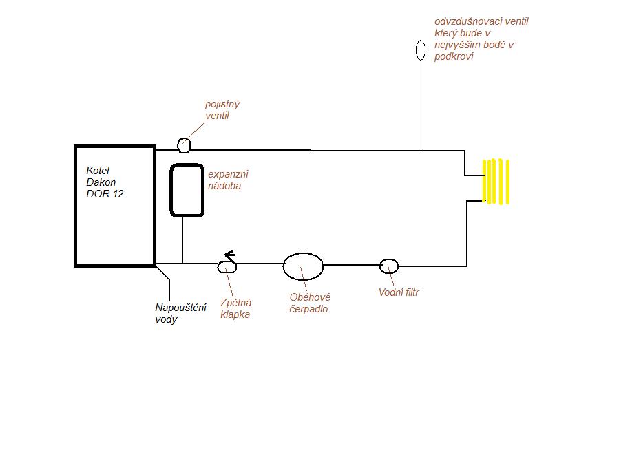 Děkuji Vám mockrát za Vaše užitečné rady. Zádný čtyř ani tři cestak tam dávat nebudu. V příloze posílám stručný plánek jak by to tedy mohlo vypadat. Jen se chci zeptat ohledne na pouštění, stačí mít jeden kohout který je u kotle? Tím vodu napouštět popřípadě i vypouštět? Nebo musim kohoutu umístit více? A kdyz budu plnit trubky vodou, kam se vytlačí ten vzduch.