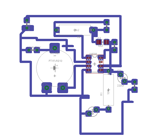 Nakresli si maličké kroužky pro vstup, zem, výstup na reproduktor a plus napájení. Pak se pokus tyto body propojit s piny na integrovaném obvodu a nakreslit cestičky od součástek. Cestičky mohou procházet pod součástkou - cestičky jsou dole, součástka (pokud není SMD) je nahoře.