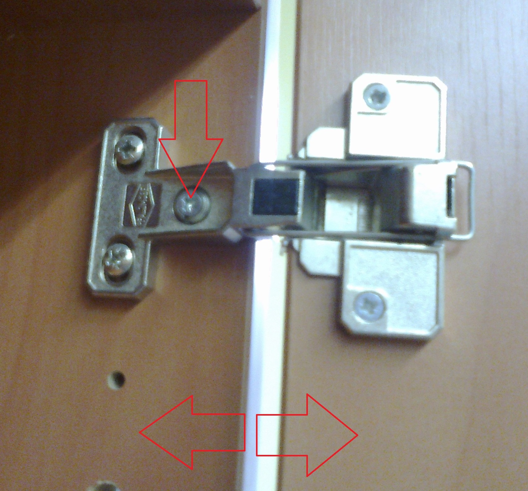 Potřebuji u nábytkové sestavy seřídit dveře skříně. Dveře v horní části nedoléhají ke korpusu asi 15mm. Skříň je osazena panty (viz obrázek) - horní šipka je pro náklon dveří do strany to už jsem zjistil. Jak ale seříditt dveře ve směru viz 2x šipka. Při povolení dvou upínacích šroubů není možnost seřízení do stran.
