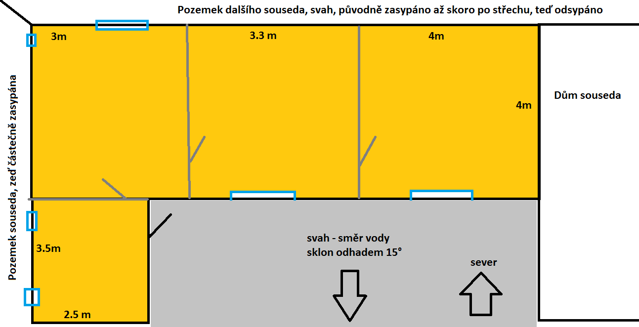Spodní voda tam je všude, ať kopnu kdekoli, voda mi vyteče ven, nicméně pozemek je z kopce, takže předpokládám poteče dolů. Meliorace možná asi není. Z jedné strany je sousedící dům, z druhé je sousedící pozemek (tam možná teoreticky by to šlo po dohodě), z další strany je vstup a betonová cesta (nedostal bych se dovnitř) a z poslední strany je takový svah a je to severní strana - hned za domem nic moc neporoste a je to souseda...