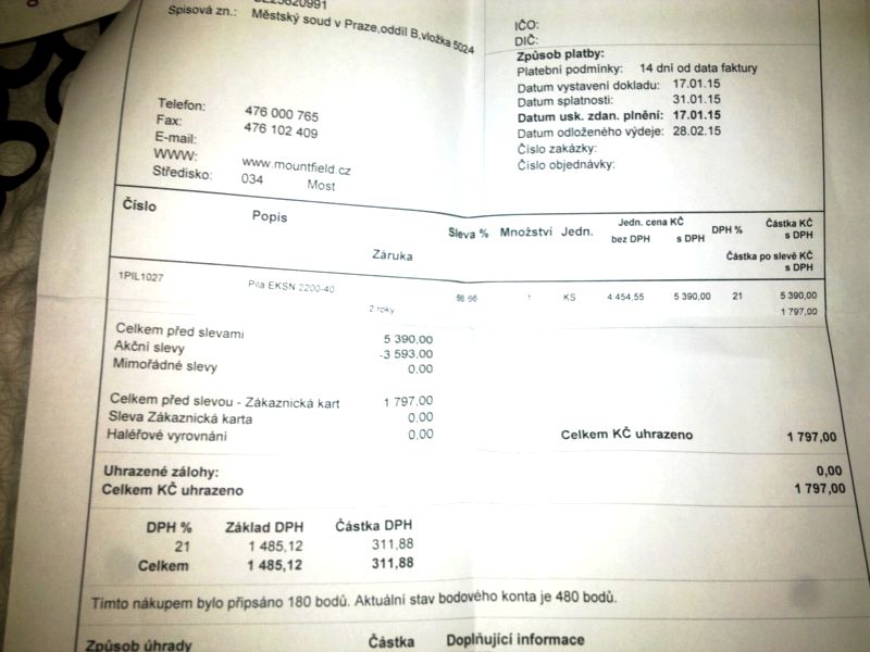 reifik - já asi před měsícem kupoval na chalupu něco podobného v Mountfieldu (EKSN 2200-40), jak měli ty velké slevy (viz. přiložené foto). Soused má stejnou značku, jen o něco slabší(1800 W), a je s ní naprosto spokojený, nařeže s ní s přehledem co potřebuje. Tak jsem zvědav jak se i mě osvědčí, zatím jí nemám vyzkoušenou, je prozatím zabalená v krabici a čeká na svojí příležitost. Vzhledem k tomu, že neprotopíme moc - chata je obyvatelná jen v sezóně, takže na těch pár polen do kamen či krbu, by za ty prachy mohla posloužit dobře. Z údajných 5390 KČ, sleva na 1797 KČ. No, nekup to...