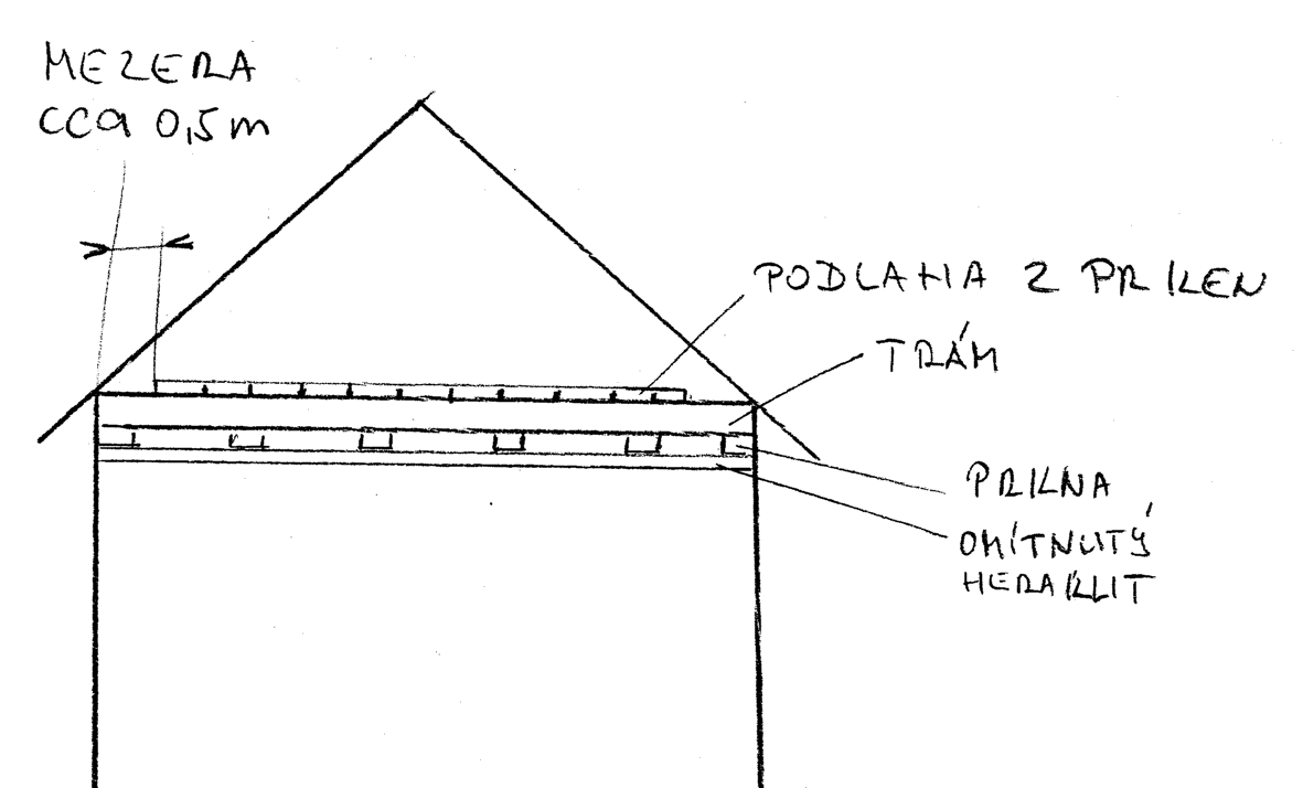 Potřebuji zateplit strop obytných místností pod nevytápěnou neizolovanou půdou Jedná se o pokoje, žádná koupelna nebo prádelna. Pod dřevěnými trámy na prkenném roštu je strop z omítnutého heraklitu. Izolace žádná, tepelné ztráty velké. Zateplení zespoda nepřichází v úvahu kvůli malé výšce místností. Potažmo tedy nelze zespoda ani vytvořit parozábranu. Místa pro zateplení z hora je mezi trámy dost, mají výšku cca 25cm. Půdu potřebujeme jako odkládací prostor, tudíž podlaha musí zůstat pochozí. V tuto chvíli je z prken, která spolu nelícují a jsou mezi nimi nepravidelné mezery 1-2cm. Podlaha navíc není od krajů půdy, ale na obou stranách je cca půl metru mezera viz obrázek. Chtěl bych zateplit vatou 2x 10cm křížem mezi trámy. Mezi vatou a podlahovými prkny by mi zbyla vzduchová mezera cca 5cm. Půdu nechci zvelebovat, jen zateplit, tudíž bych zachoval stará nelícující prkna i mezery od krajů. Je to dostatečné pro odvětrání vlhkosti nebo mám někam vnutit parozábranu, případně kam. Jak jsem psal ze spoda to opravdu nejde.
