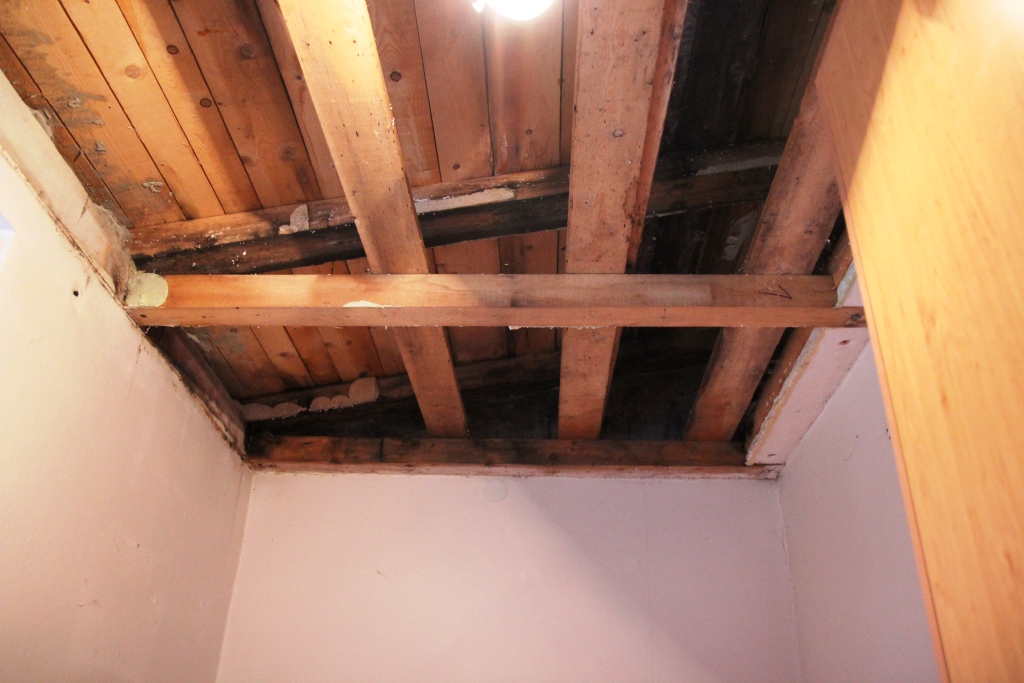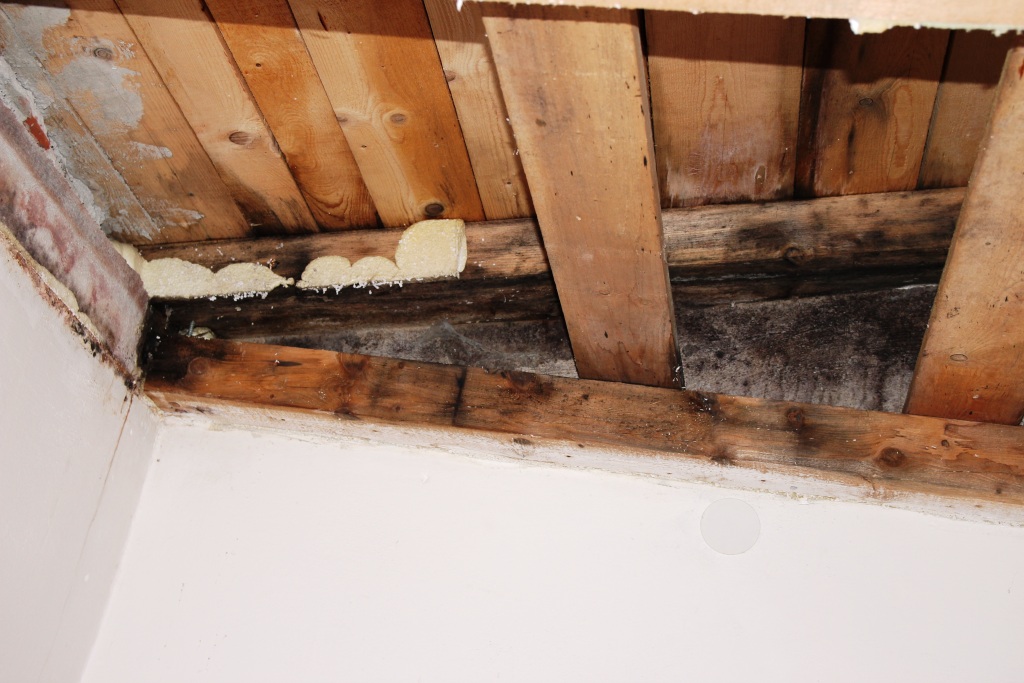 Izolace je tam, kde jsme se zde ,,domluvili,,. VOda zatím nevím odkud teče bo to nemáme zhozené zatím. Každopádně voda (kapky) jsou mezi spoji stropnic. Jdou vidět že jsou i zvlhle jelikož se začínají kroutit.