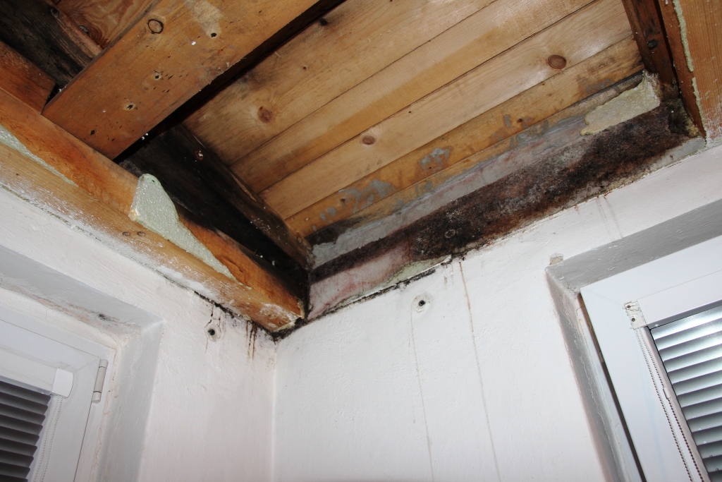 Jedná se o přílepek k báráku který je zde již řadu let. Původně byla na střeše plechová krytina, ketá již nebyla v pořádku a tak se vyměnila za asvaltovou. Skladba střechy je nyní znázorněna na skice.. Voda nebo plíseň se oběvila na spojích mezi polystyrenem a nebo ,,štítovou,, zdí která nebyla zatebla ze vnitř. Dům je celkově nezateplený.