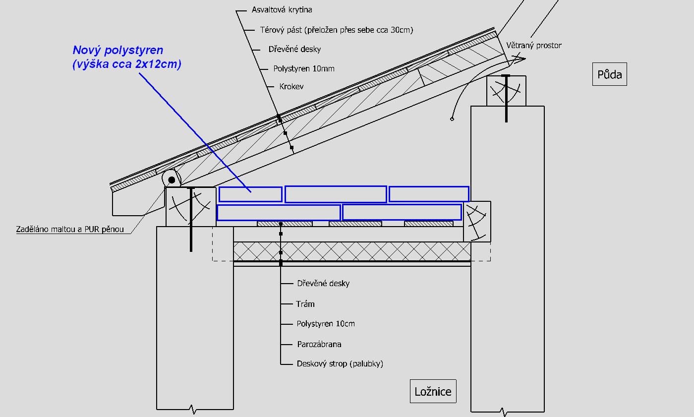 Pánové vrátím se k tomu zpět, myslíte že když dáme polystyren nad strom cca 2x12cm a odvětráme ten trojuhelník, že by to mohlo pomoct? Necheme kupovat vatu, jelikož se nám ve dřevníku válí polsterenové desky o tl. cca 12cm.