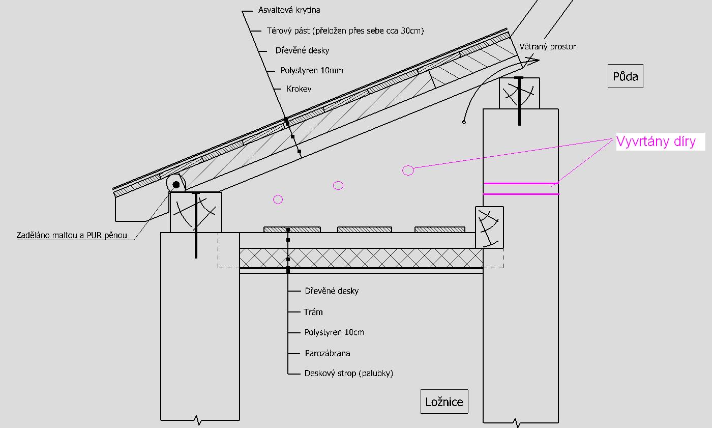 V místnosti kterou jsme ,,zateplili,, jako je v obrázku Strop se zase objevila obrovská vhkost. Mezi trámy se položil polystyren tl. 10cm, na něj přišel další tentýž a na něj ještě další polystyrenová deska o tl. 5cm. V průběhu vánočních svátku jsme se však zděsili když jsme otevřeli ložnici. Ze stropu vyloženě kapala voda. Celkově mohlo z podstropnic vytéct cca půl litru vody. Ten trojuhelník je z půdy navrtán a totéž je ve venkovním zdivu (při přiložení ruky lze cítit slabý průvan). Měl by být tedy tento prostor odvětrán.