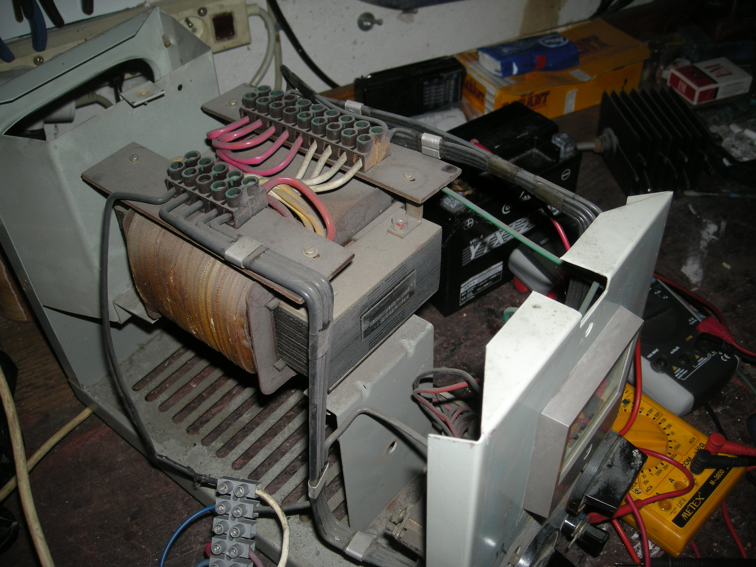 Kondenzátorová nabíječka se tak jmenuje proto, že proud se řídí kondenzátory na primáru. Trafo vypadá bytelně, regulace sycením jádra se neuplatní.