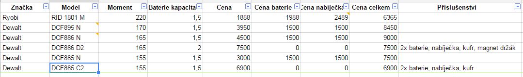 Delal jsem si takovou porovnavaci tabulku tech utahovaku... Celkova cena je vzdy s dvemi bateriemi. Ty s neviditelnou poznamkou jsou bezuhlikove