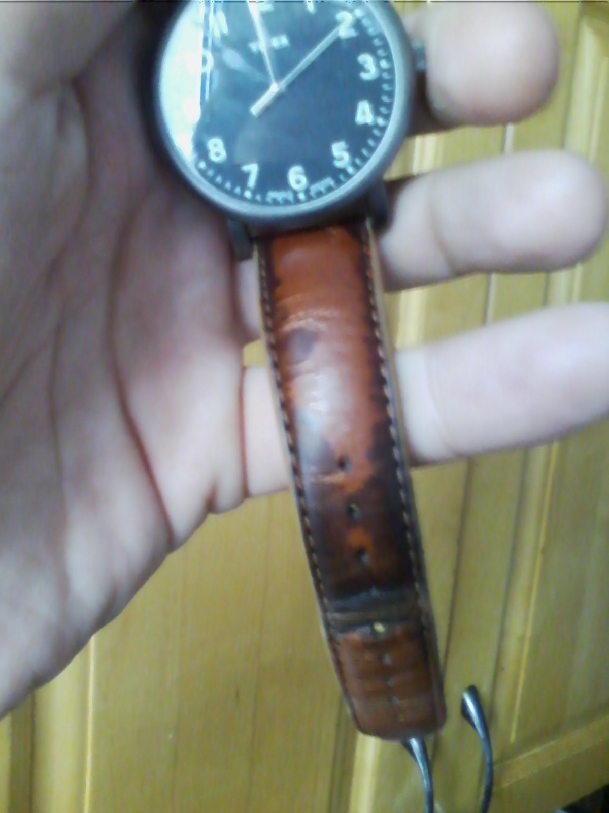 Dobrý den,pokud se jedná jen o fleky vzniklé vlhkem,nechat pásek uschnout a potom použít lihové mořidlo na dřevo požadovaného odstínu a potřít houbičkou.Tuto metodu znám od kamaráda sedláře.Nechat mořidlo zaschnout ,pak máznout indulonou a vyleštit.