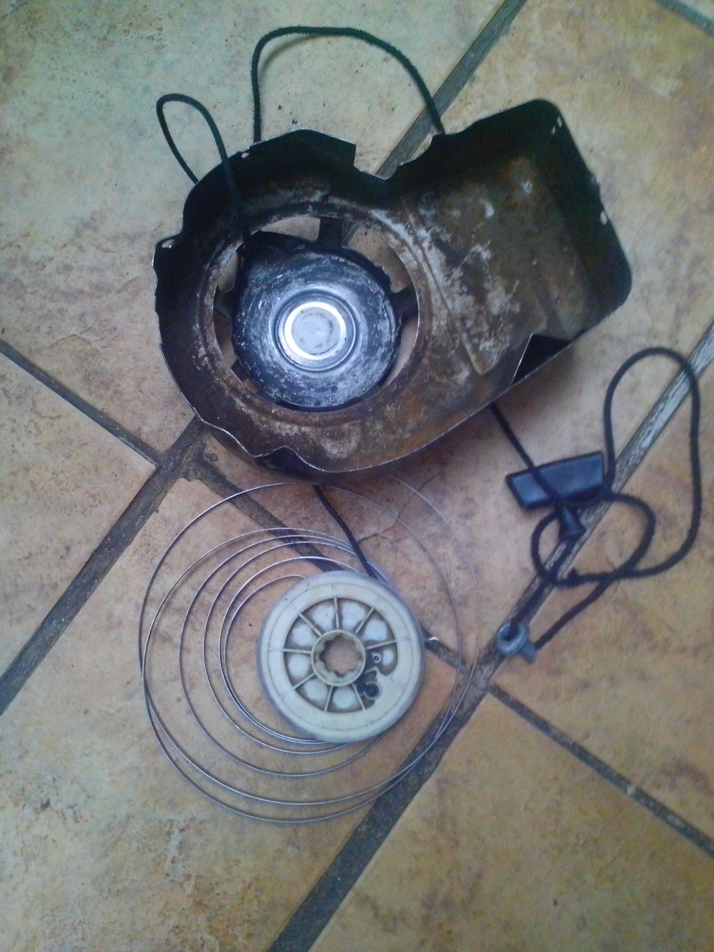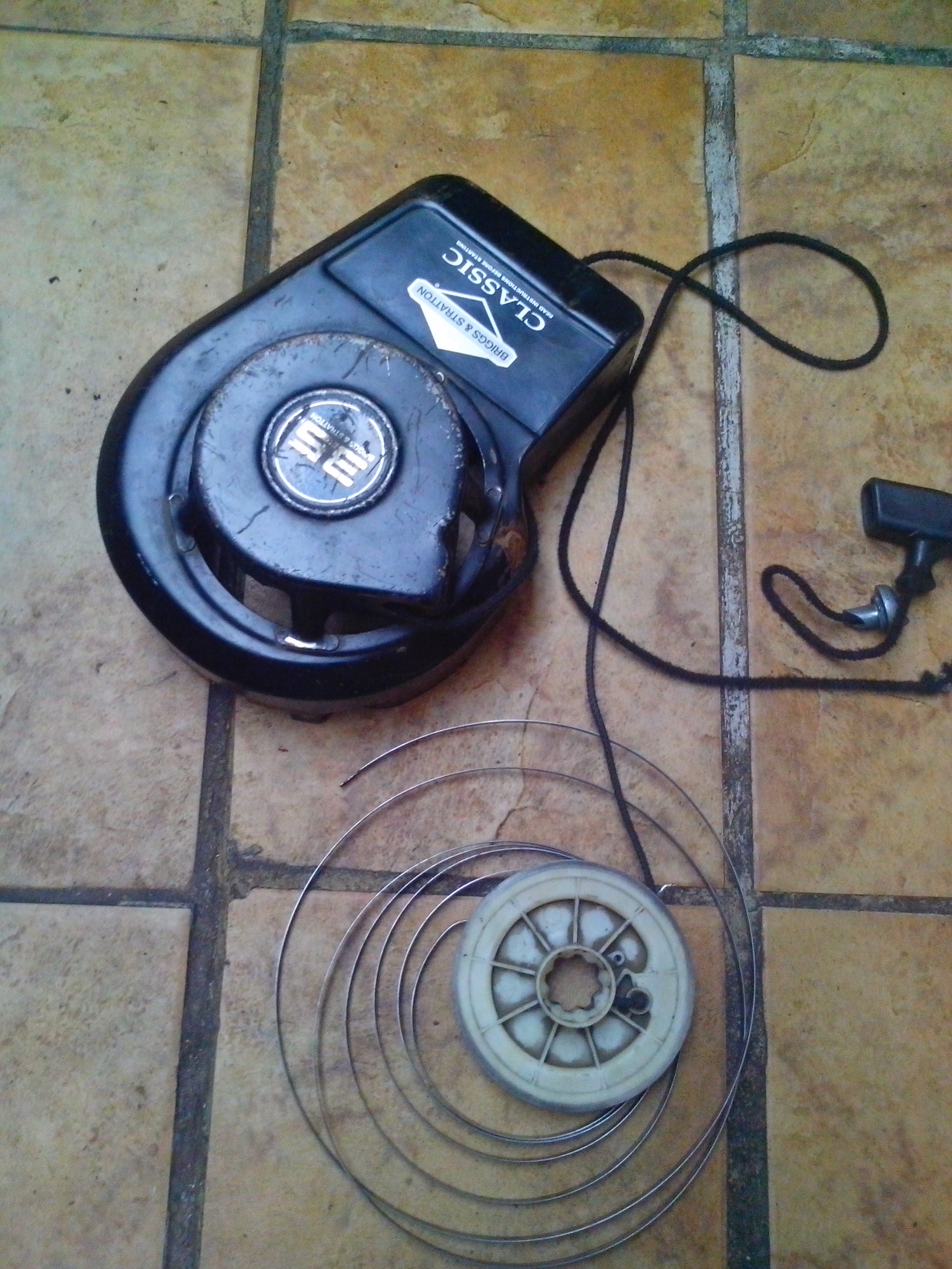 Založíš pružinu,na to koliesko s namotanou šnúrkou,ktorú si predtým zbavil rukoväti,drží sa to tam na uzlíku,ako v rukoväti,tak aj na tom umelom koliesku,pootočíš tým kolieskom tak aby si trochu našpanoval tu pružinu,prevliečeš tú šnúrku cez dierku v plechu,prevlečieš cez rukoväť a zaistíš uzlíkom.To umelé koliesko by sa malo tiež zaistiť na hriadeli segerovou pistkou.NO TERAZ K PODSTATE: Na obrázku má tá pružina ulomení koniec,ktorý je ohnutý a ktorý treba nahriať napr.nad plynovým šporákom a ohnuť smerom von od kružnice pružiny o 180 stupňov späť tak aby sa tým koncom dala vložiť na to miesto kam ten koniec patrí.Inak je tam motor Brigess& Straton a túto vec vám opravia v Monfielde určite.
