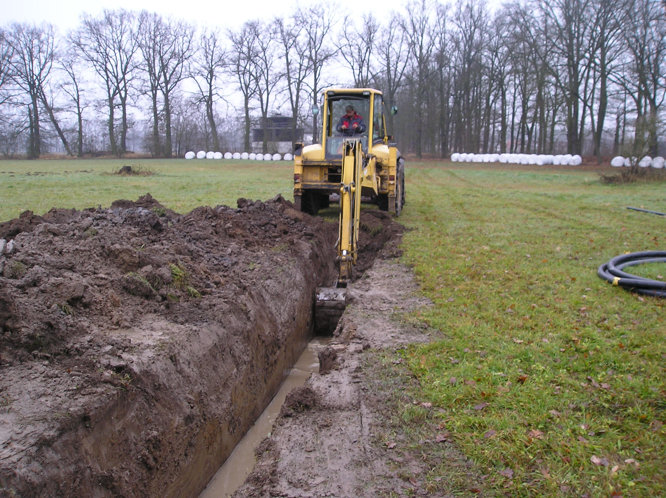Tohle byla brnkačka. Vyčerpala se voda, bleskově se položila geotextilie, písek, trubka tlakové kanalizace, písek a zasypalo se to. Stavět pod hladinou spodní vody lze celkem snadno. Vedle objektu se vykope čerpací jímka, hlubší než jsou základy. Osadí se čerpadla s hladinovým spínačem a staví se v suchu.