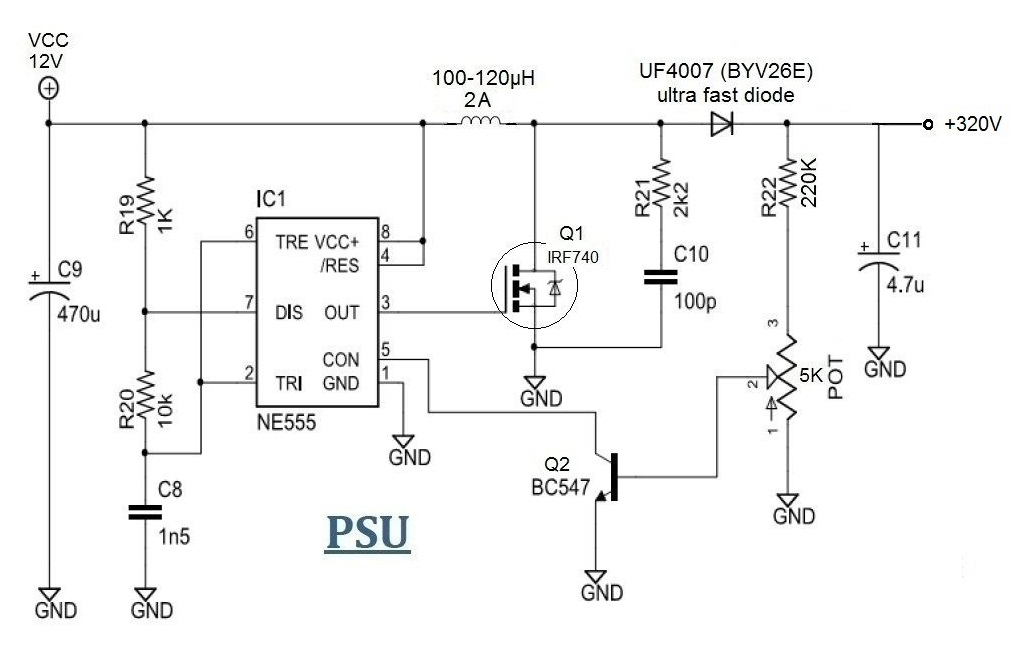 Zdar. Buduju elektronkový efekt ke kytaře, bude to napájený 12V pro žhavení a jako zdroj pro anody je jednoduchý zvyšující měnič s 555, MOSFET a cívkou. Viz schéma.