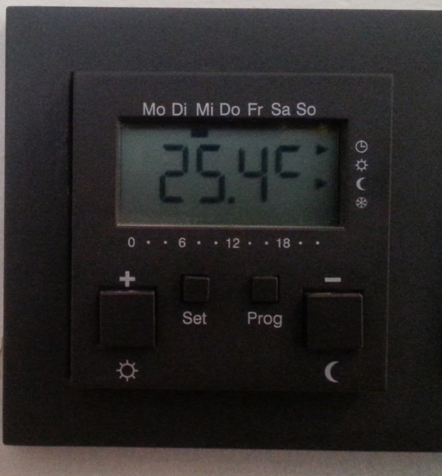 Možná, cucám si to z prstu, možná někde najdete typ termostatu a podle toho i návod k obsluze, nebo někdo z dětí s inteligencí pro nastavování těchto programovatelných hraček na to přijde a nastaví vám to a naučí vás to. Není to nic ponižujícího, děti mají zkušenosti s podobnými přístroji, hračkami, digitálními hodinkami, předvolbami čehokoliv, dálkovými ovladači, nebo na základě podobných zkušeností najdou správný postup.