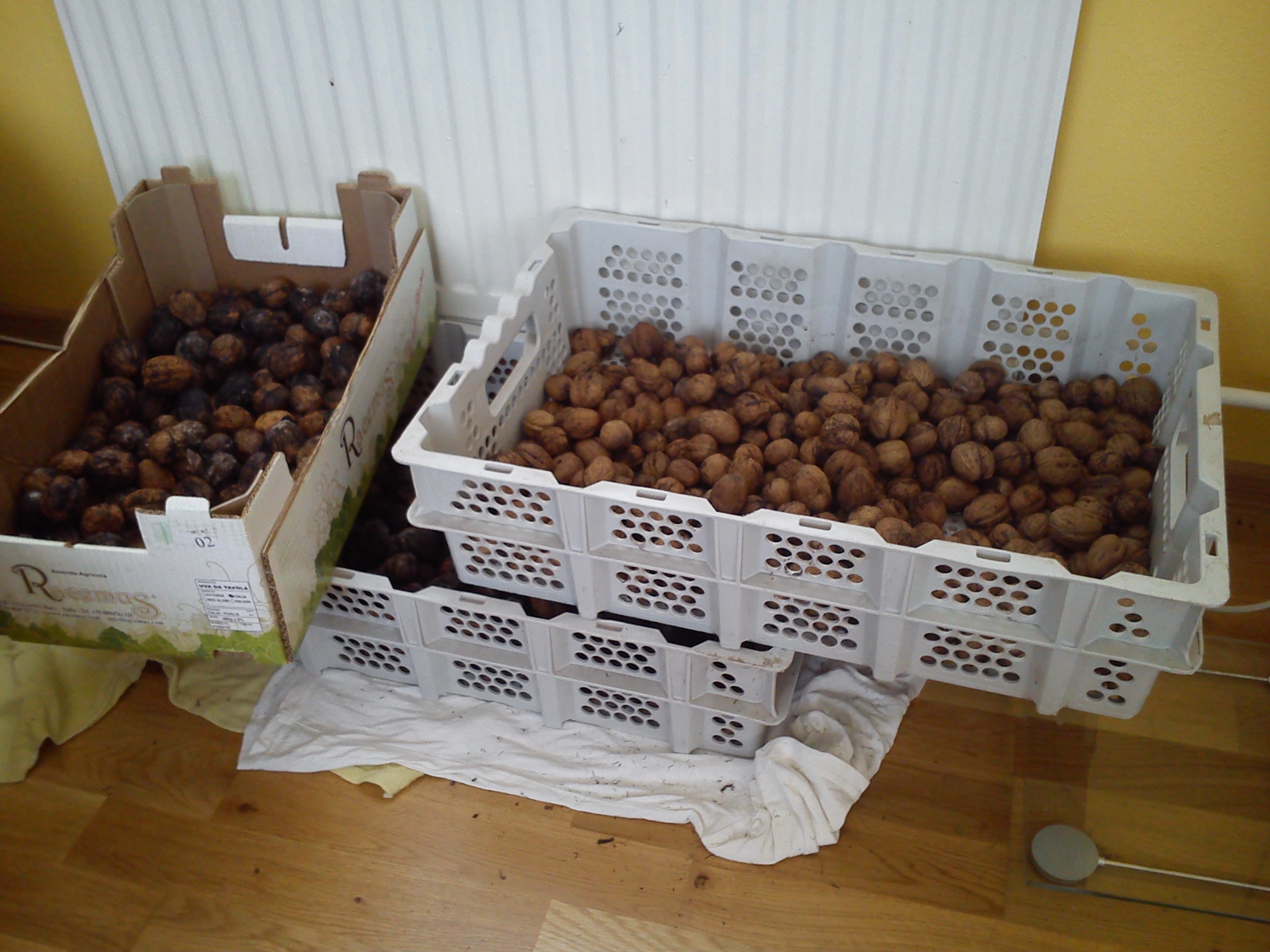 Tenhle problém s ořechy je letos celkem rozšířený. Také nás to postihlo, myslím tu černou blátosrajdu. Když jsme ořechy sušili bez většího očistění, hodně chytaly nějakou bílou plíseň (viz. fotky). Tak jsme je očistili co to šlo a celkem sprostě proprali v sudu s vodou. Plavou, tak se jim musí hodně pomáhat, ale výsledek je ohromný. Pak je normálně sušíme a teplota sušení by prý neměla přesáhnout 25°C.