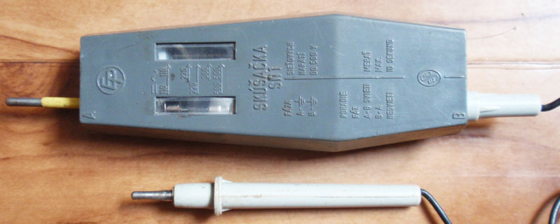 Edit:// Pozor, kolík vlevo pro kontrolu fáze, vpravo se měří napětí tím vrčícím čudlíkem uvnitř, pak se dá i do prava ten spodní kabel a měříme napětí mezi kolíkem a kabelem (například kolík na fázi, kabel na zem).
