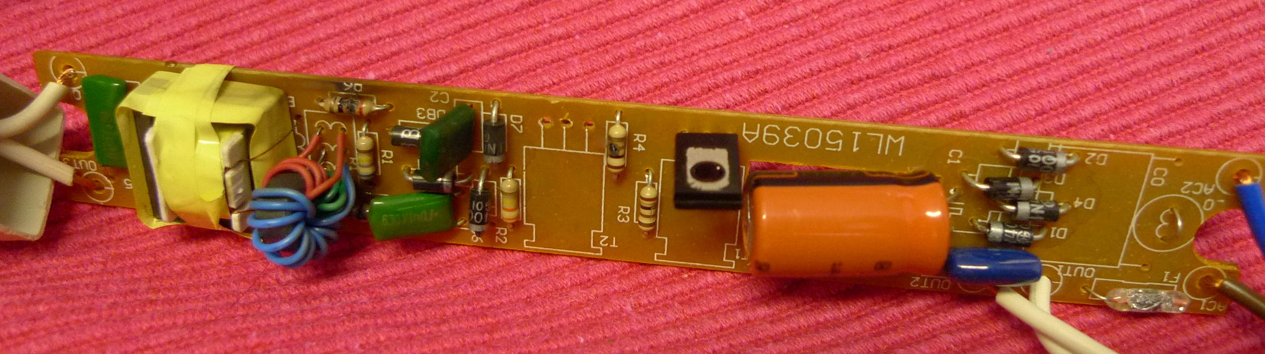 (jinač, má vyhořelé 4 z 5ti odporů, pojistka a oba tranzistory. Kondíky se zdají být ok. Diody jsou taky ok(a nevím ten driak) )