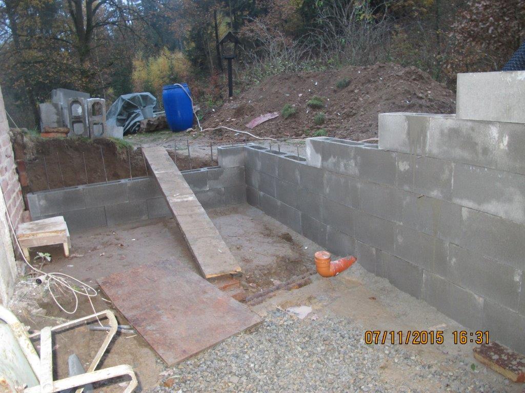 - dřevostavba na cihlovém suterénu zpola zapuštěným v zemi. V rámci úpravy terénu jsem celou jednu stranu odkryl a udělal zídku ze ztraceného bednění (šíře 20cm) - bude zde střechou plně kryté zápraží, tj. žádná voda by se tam dostat neměla - pro jistotu tam bude jedna bodová vpusť.