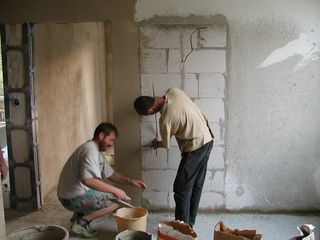Pro názornost. Na první fotce je patrná zazdívka původních dveří a řezaly se dva nové otvory vedle sebe. Je tam vidět ocelový ztužující rám navržený statikem. Bylo to v prvním patře čtyřpatráku.