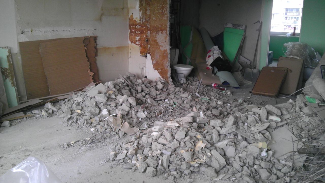 Zbylé dvě fotky stav bytu po téměř kompletním vybourání příček bezhlučnou metodou. Tuším že páté patro osmipatráku.