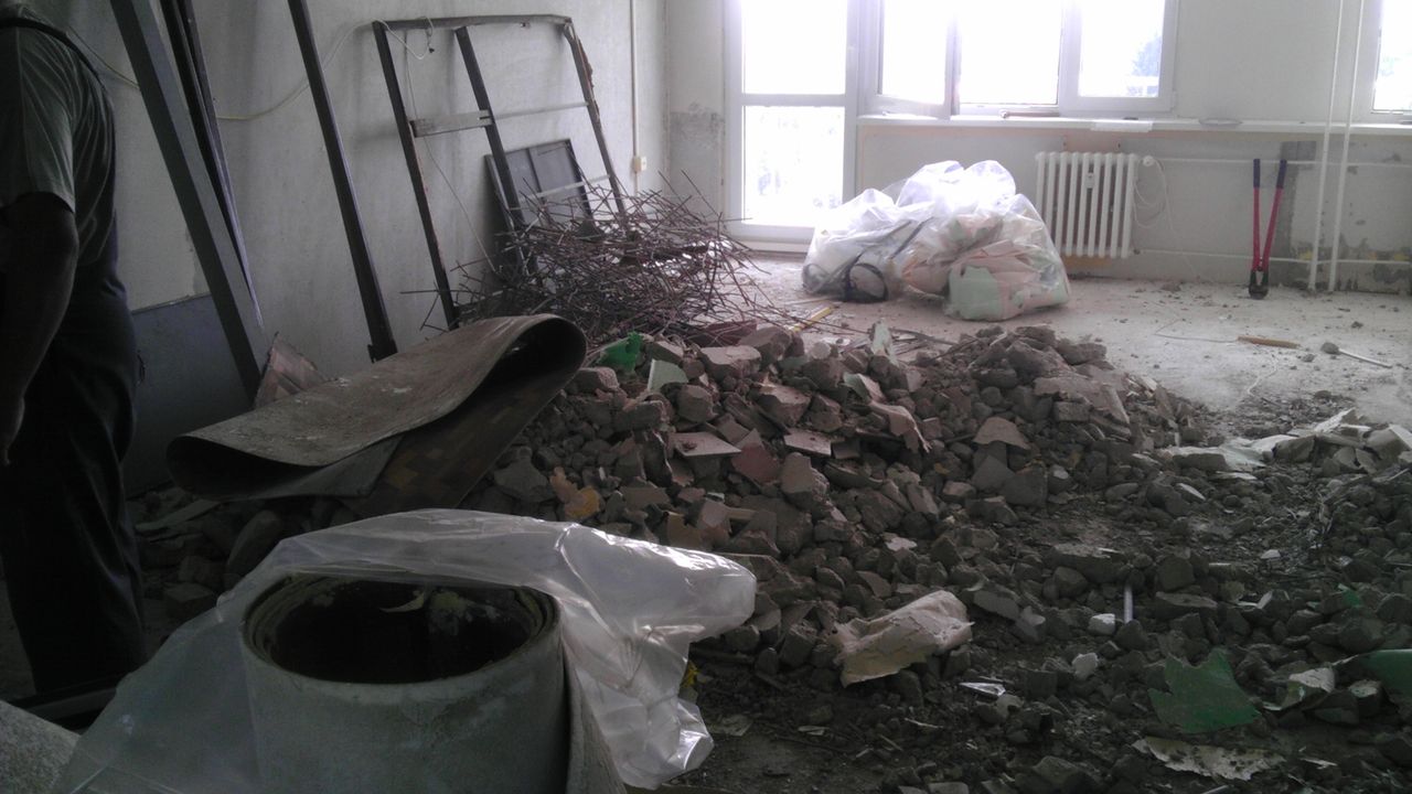 Zbylé dvě fotky stav bytu po téměř kompletním vybourání příček bezhlučnou metodou. Tuším že páté patro osmipatráku.