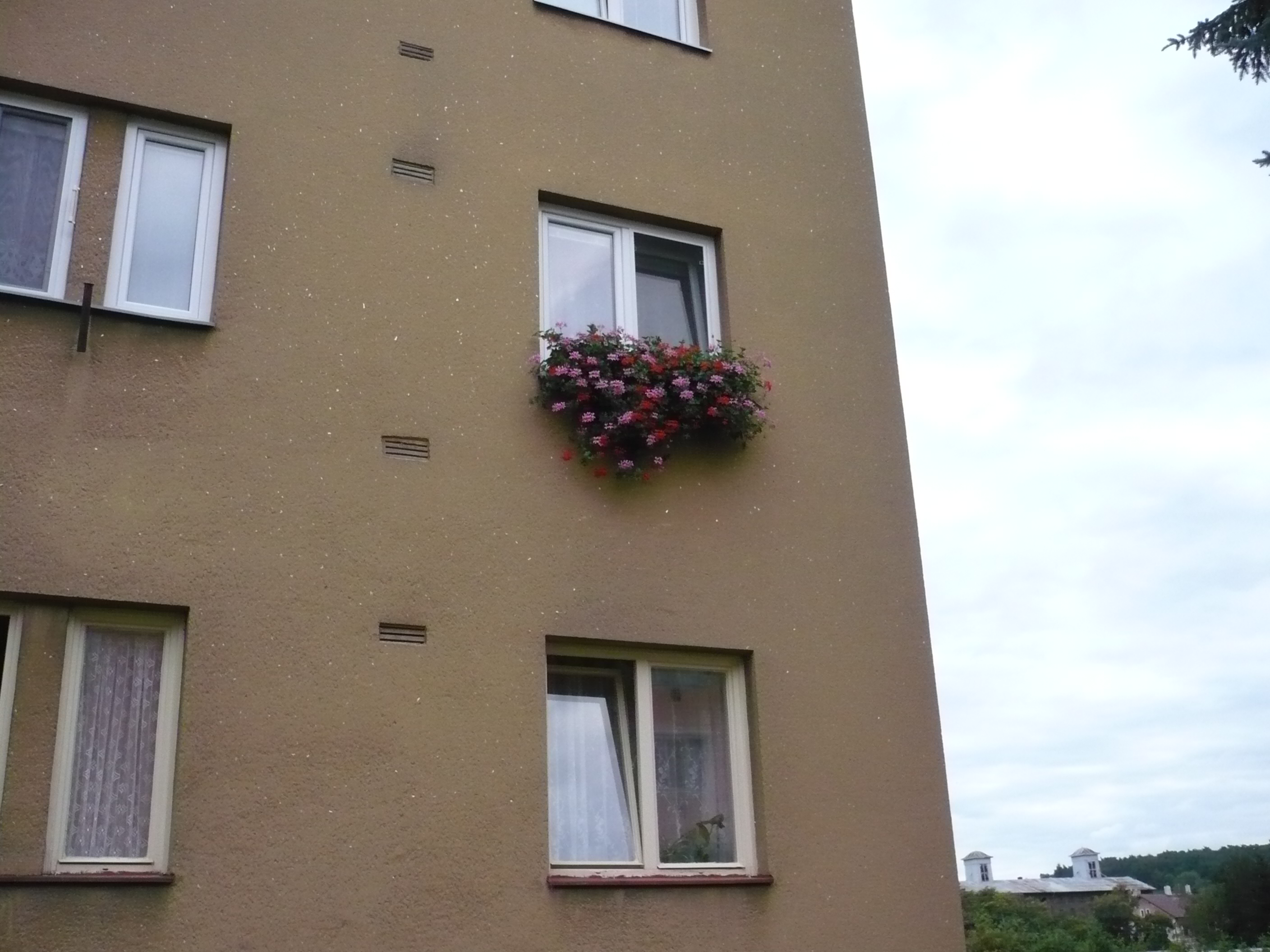 Odtah na fasádu ti musí povolit správce nebo majitel domu.A nevím, jestli nebude problém s tím oknem…