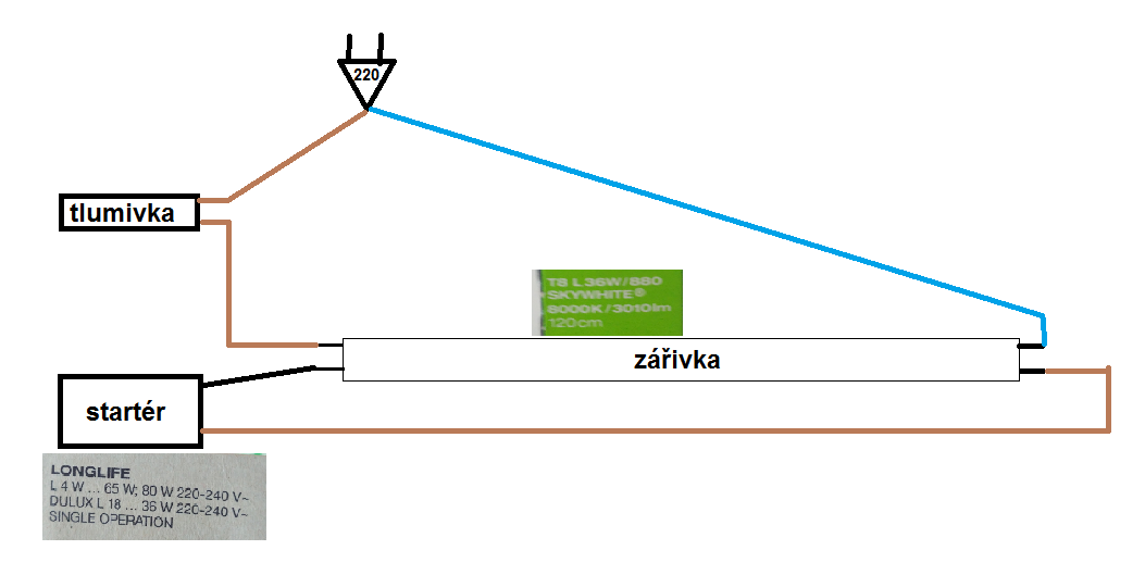 Zkuste místo startéru dát vypínač a sepnout na cca 5sec. Oba konce zářivky by se měly nažhavit. Po r… poslední