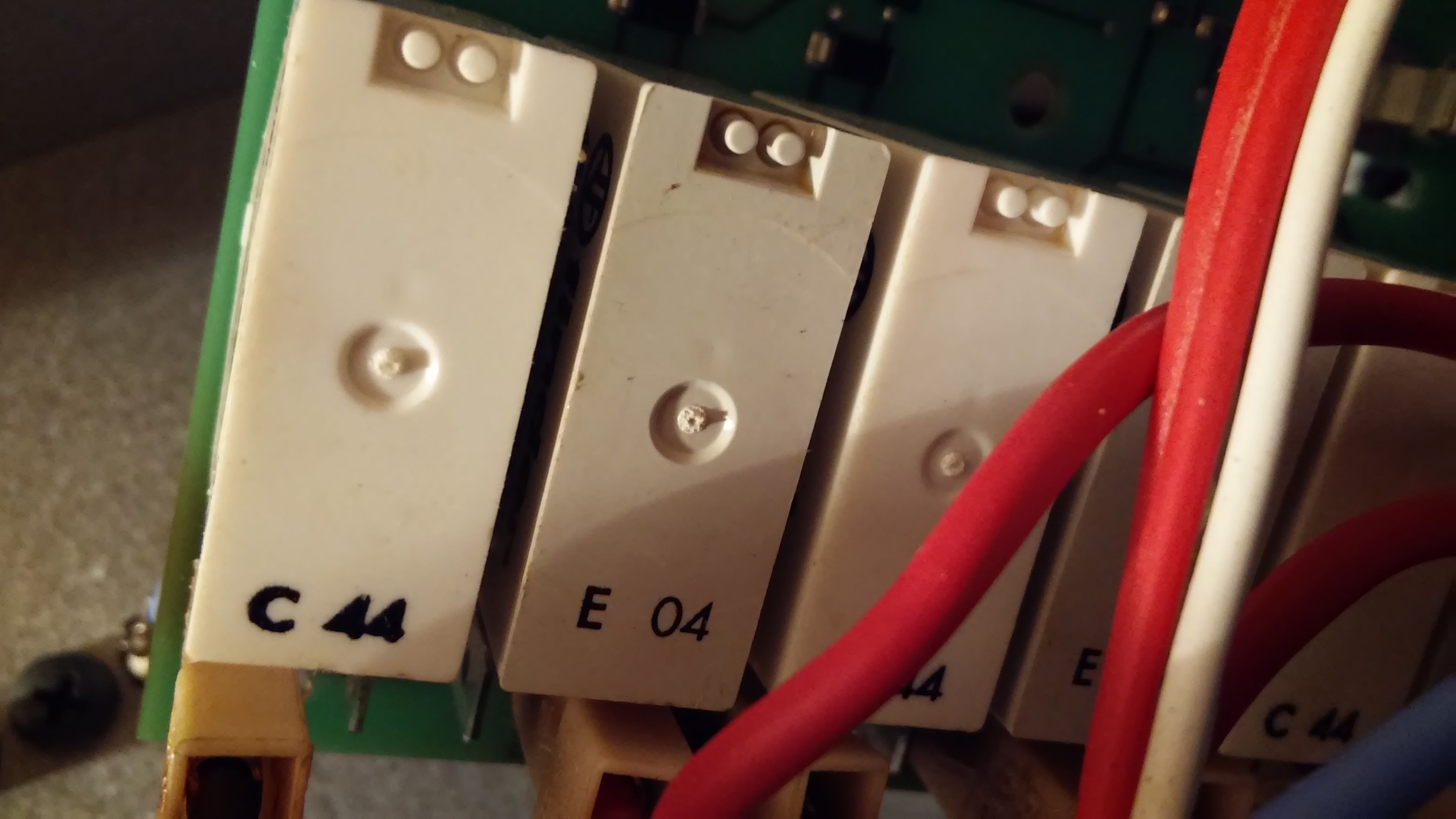 Zajímavé taky je, že relé se na desce střídají s označením, vždycky ty dvě v sérii k jedné spirále mají označení shora pouzdra C44 a E04 - že by se něčím lišily? Jedno spíná jako poslední, druhé rozpíná jako poslední? Podle materiálu kontaktů?