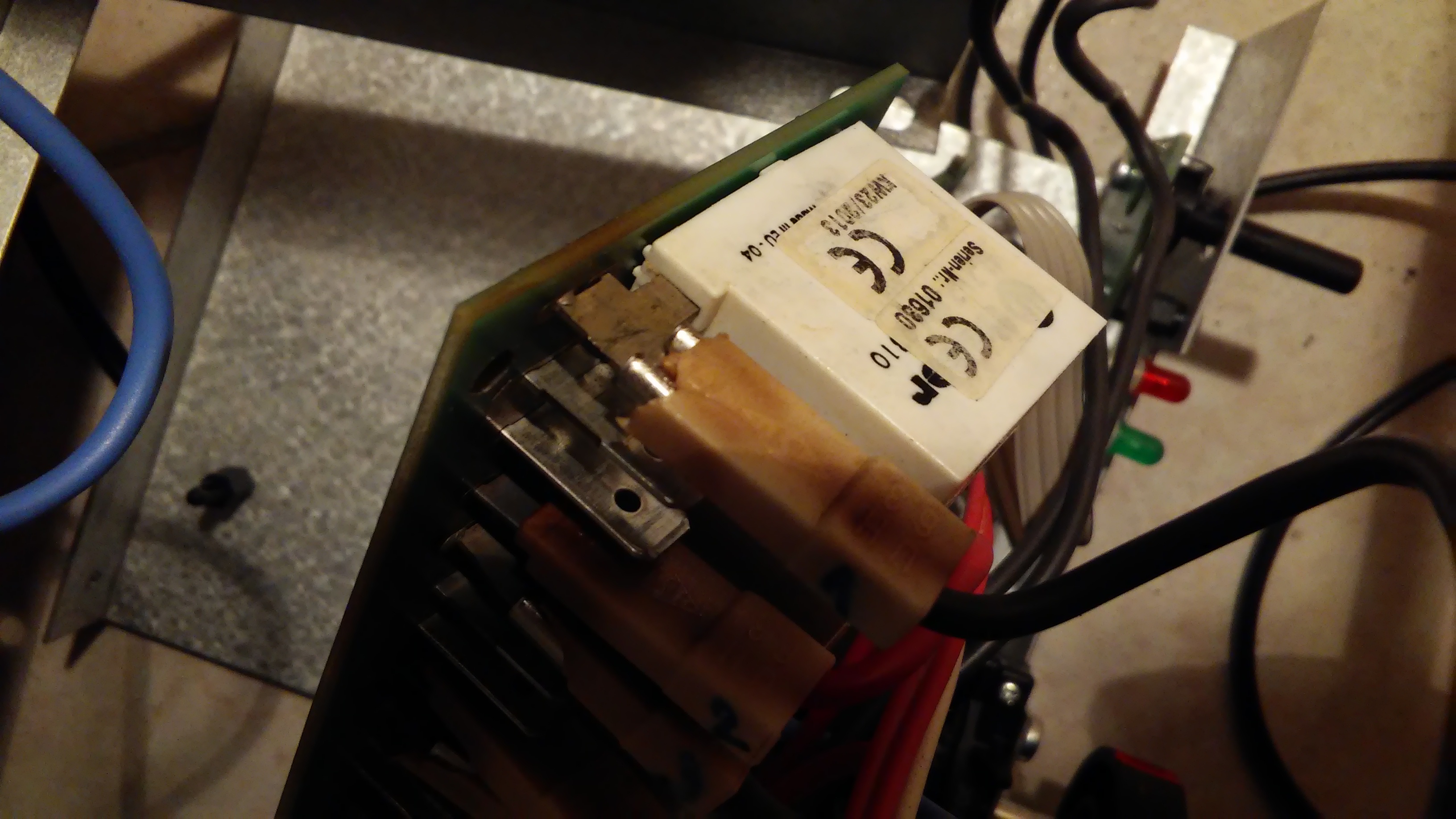 Jo pravda svorky jsou nechutně přehřáté, jsou to dva různé kovy na sobě, ten na relátku je pájecí, ten co je na tom nastrčený ten vůbec nejde přinutit, aby se na to chytl cín, drátky jsou jen zmáčknuté, chtěl jsem je propájet, ale nemožné. Podezírám, že je to napůl přehřáté stykem, napůl těma jen zmáčknutýma drátkama. Jenže zase cín už by se asi tavil, ty umělohmotné krytky (původně zřejmě bílé, nyní hnědé) se rozlamujou na dotyk.