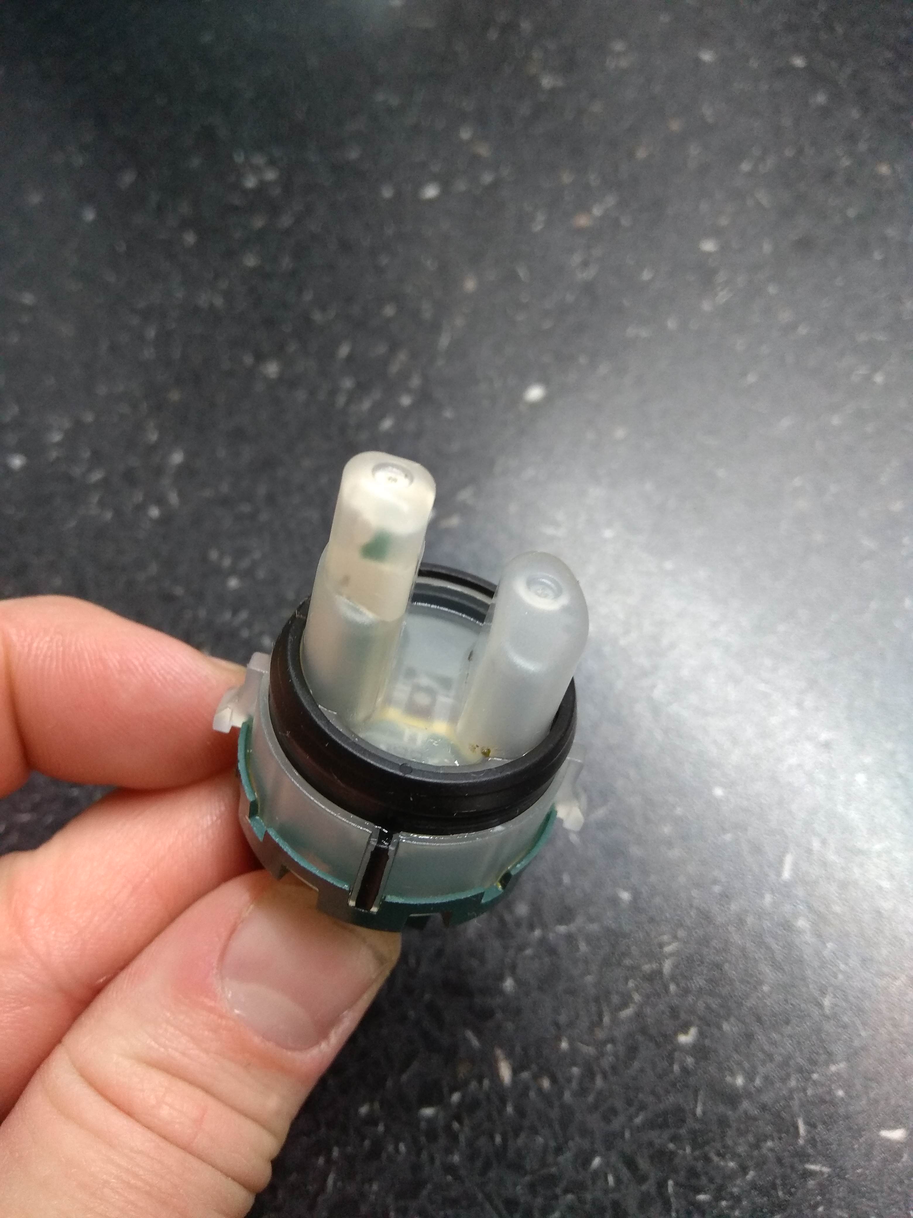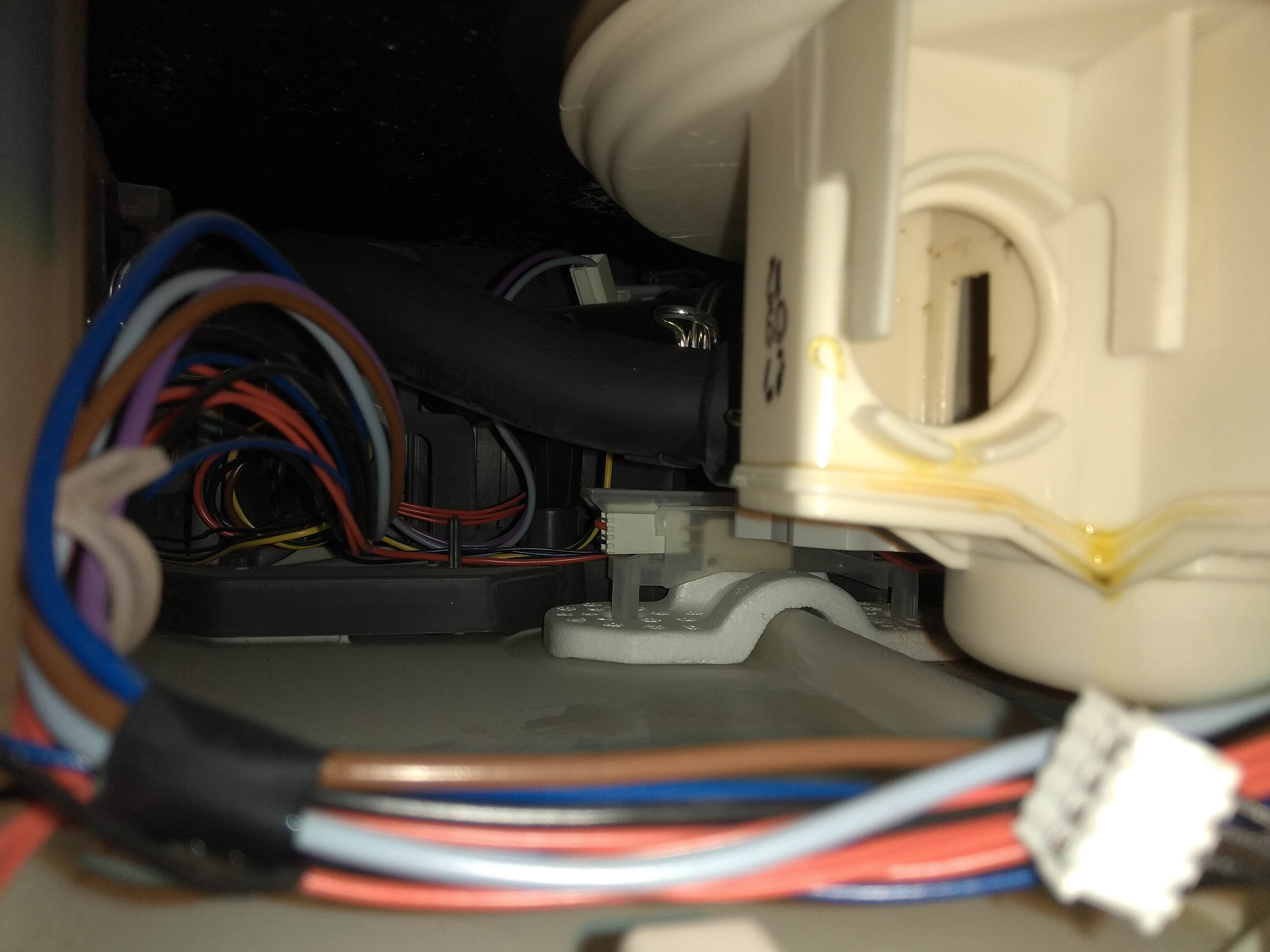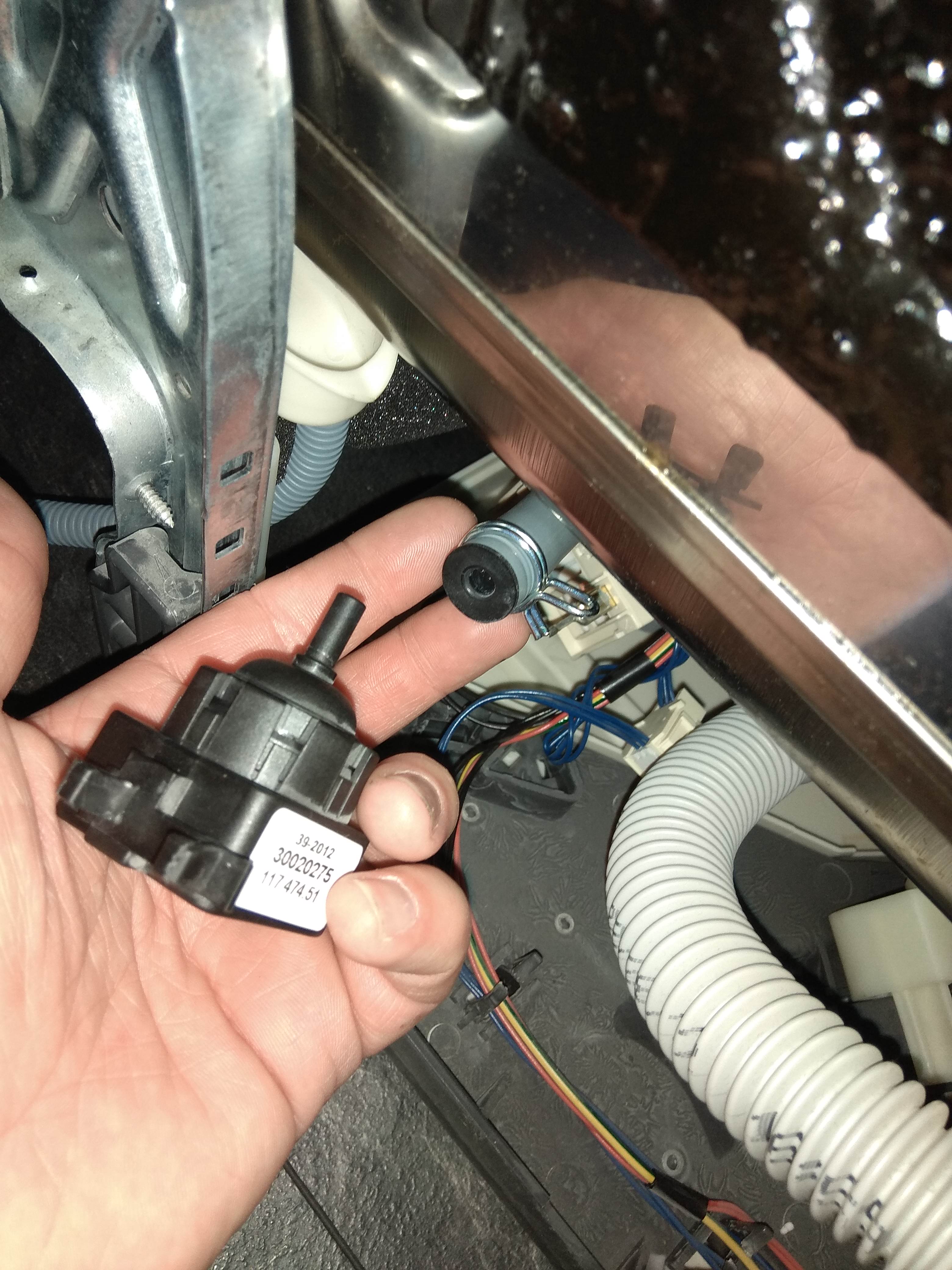 o Vytaženo čidlo hladinového spínače (nepodařilo se změřit změnu odporu při přetlakování pusou – ale docházelo ke „klapnutí“ (později zjištěno, že je to asi indukční a ne odporový spínač a že to asi není vhodné dělat "-)). K hadičce hladinového spínače připojena další hadička, ke které připojena PET s horkou jarovou vodou a samospádem vytlačen do myčky „mastný nepořádek“ (předtím jsem to zkoušel pusou a bylo to průchozí, ale po této operaci zjištěno, že jsem musel "fouknout" pod vyšším tlakem)– 2x opakováno. Nevyřešeno. Je možné, že následným problémem mohlá být vzniklá pěna z jaru - ale vlastní vypouštění fungovalo, tak jsem to neřešil.