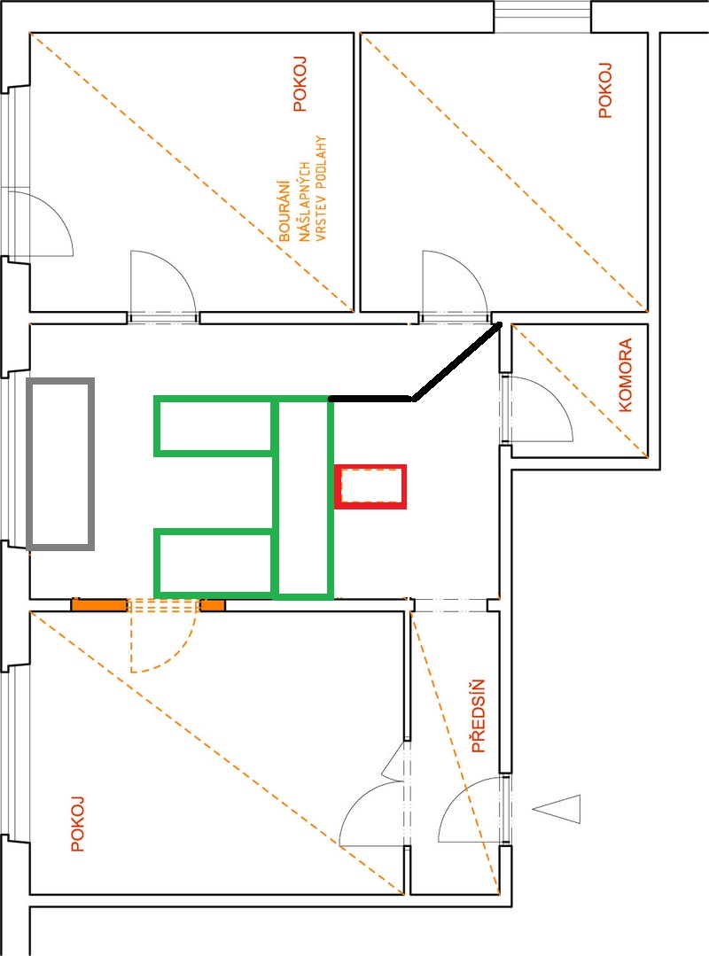 Ten novej stav se mi zdá trochu pomatenej. Bylo by možné dodat dispozici s popiskama? Stačí na kus papíru a oskenovat nebo vyfotit. Ta černá šikmá čára co jde do kouta mezi komoru a pokoj jestli to má být příčka tak to je pěkná pitomost. Představ si jak se ti zúží průchod do pokoje a jak tam budeš stěhovat nábytek. Přišoupni si k nějakým dveřím skříňku, kus desky a zkus si to.