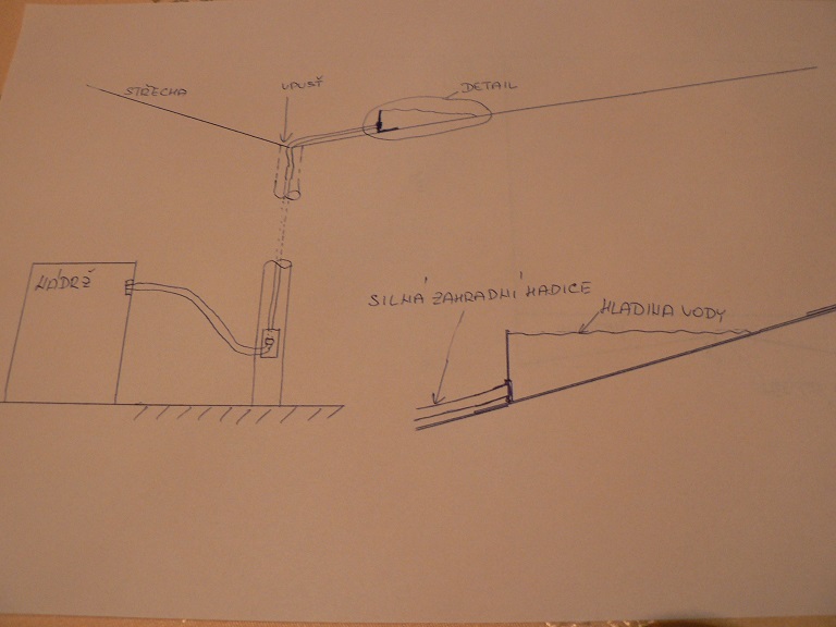 No teď mě ale něco napadlo.Nebyla by to sice voda z celé střecha, ale minimálně z půlky. Teklo by to samospádem. Zkusil jsem to nakreslit. Ta přehrada :-D tak cca 10 cm a po celé šířce střechy a stojací voda mimo jakékoli napojení lepenky.U krajů a oplechování by se to už dalo v takto malém rozsahu ohlídat a ošetřit.Ta hadice by byla protáhnuta skrz celou rouru a vyvedena krytem na čisticím otvoru přes nějakou průchodku. Přehrazení na střeše by bylo z plechu přilepeného na původní lepenku.