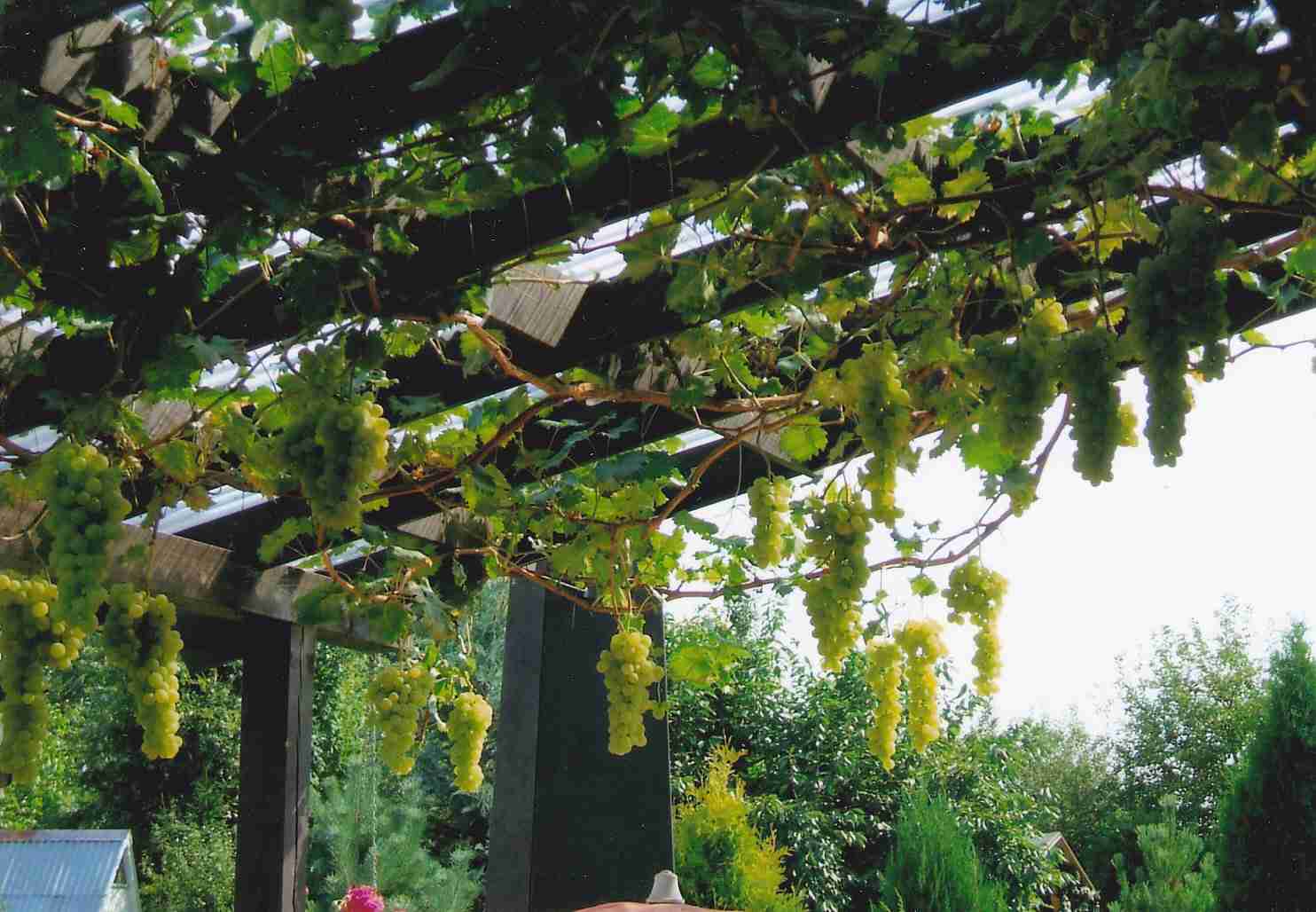 Máme také pergolu podobných rozměrů, i ten sklon odpovídá. Máme jako střešní krytinu průhledný trapézový polykarbonát (je sice dražší, ale levné trapézové PVC nám rozmlátily kroupy). U sloupů máme vinou révu, která je zachycená na trámcích pergoly, krásně stíní a plusem je, že ještě sklízíme moře hroznů. Moc se jí pod tím polykarbonátem líbí. Než se pořádně rozrostla tak, aby poskytovala stín, měli jsme pod krytinou na trámcích připevněnou bílou netkanou textilii, se kterou se normálně na zahrádkách přikrývá sadba.